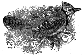 The blue jay[45] (fig. 17) is a conspicuous member of our bird population east of the Plains, especially in autumn when his brilliant plumage contrasts vividly with the brown foliage. Even in winter he stays with us, though at this time he is less common along our northern border. In spring and summer, while by no means uncommon, the blue jay is not so often noticed, as the retiring disposition which he assumes during the breeding season assists in protecting him from enemies. This also allows him to carry on with considerable impunity that inglorious practice of nest robbing of which, in a measure, he has been rightfully accused.