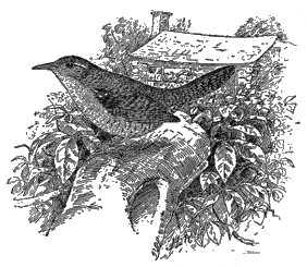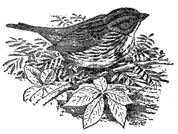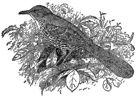 The brown thrasher[14] (fig. 5) breeds throughout the United States east of the Great Plains, and winters in the South Atlantic and Gulf States. It occasionally visits the garden or orchard, but nests in swamps or in groves standing upon low ground. The thrasher’s favorite time for singing is in early morning, when, perched on the top of a tall bush or low tree, it gives an exhibition of vocal powers which would do credit to a mocking bird. Indeed, in the South, where the latter bird is abundant, the thrasher is known as the sandy mocker.