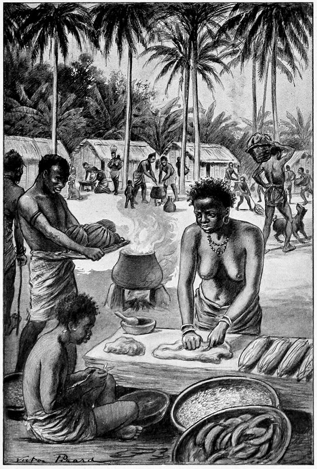 The evening of our arrival, all my hunters and their wives, and all the slaves on the plantations came to spend the evening with me. Regundo, Oshoria, Ngola, Ogoola, and Quabi stood beside me. Before us on the ground were the four tusks of the elephants we had killed, and their two tails.
