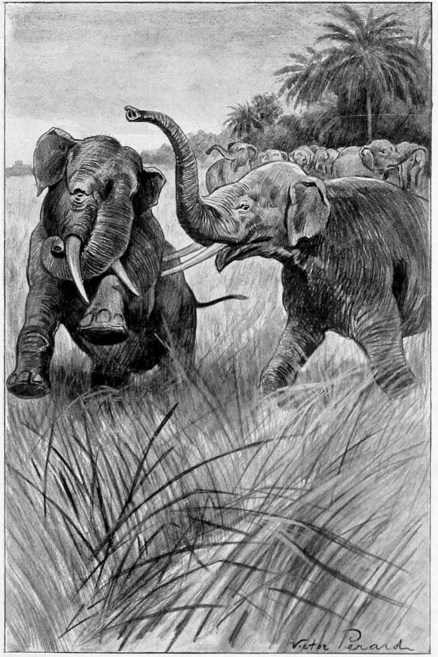 213“Often,” concluded Oshoria, “one finds big tusks of ivory in the forest. These come from elephants killed in like manner. Some also come from elephants who have died of old age or of their wounds some time subsequent to such a fight as this one.”