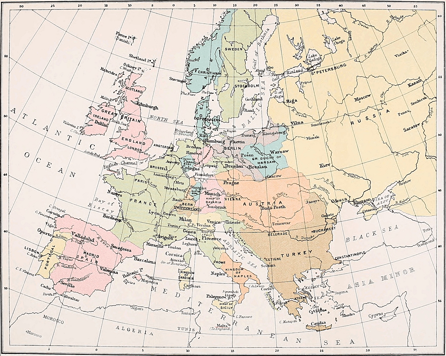 | Causes of Growing Disagreement between Alexander and Napoleon—Intervention of Castlereagh and Bernadotte—The Attitude and Internal Policy of Prussia—Invasion of Russia by Napoleon—Battle of Borodino—Retreat of the French from Russia—Campaign of 1812 in the Peninsula—Battle of Salamanca—Policy of Bernadotte—Prussia declares War—First Campaign of 1813 in Saxony—Armistice of Pleswitz—Convention of Reichenbach—Congress of Prague—Austria declares War—Second Campaign of 1813 in Saxony—Battle of Dresden—Treaty of Töplitz—Battle of Leipzig—General Insurrection of Germany against Napoleon—Campaign of 1813 in the Peninsula—Battle of Vittoria—Wellington’s Invasion of France—Negotiations for Peace—Proposals of Frankfort—The Allies invade France—Napoleon’s first Defensive Campaign of 1814—Other Movements against Napoleon—Bernadotte—Holland—Battle of Orthez—Italy—Congress of Châtillon—Attitude of France towards Napoleon—Treaty of Chaumont—Napoleon’s Second Defensive Campaign of 1814—Occupation of Paris by the Allies—The Policy of Talleyrand—The Provisional Government—Alexander’s Speech to the French Senate—Napoleon declared to be no longer Emperor—Abdication of Napoleon—Provisional Treaty of Paris—Battle of Toulouse—Arrival of Louis XVIII., and his Assumption of the Throne of France—First Treaty of Paris, | 299 |