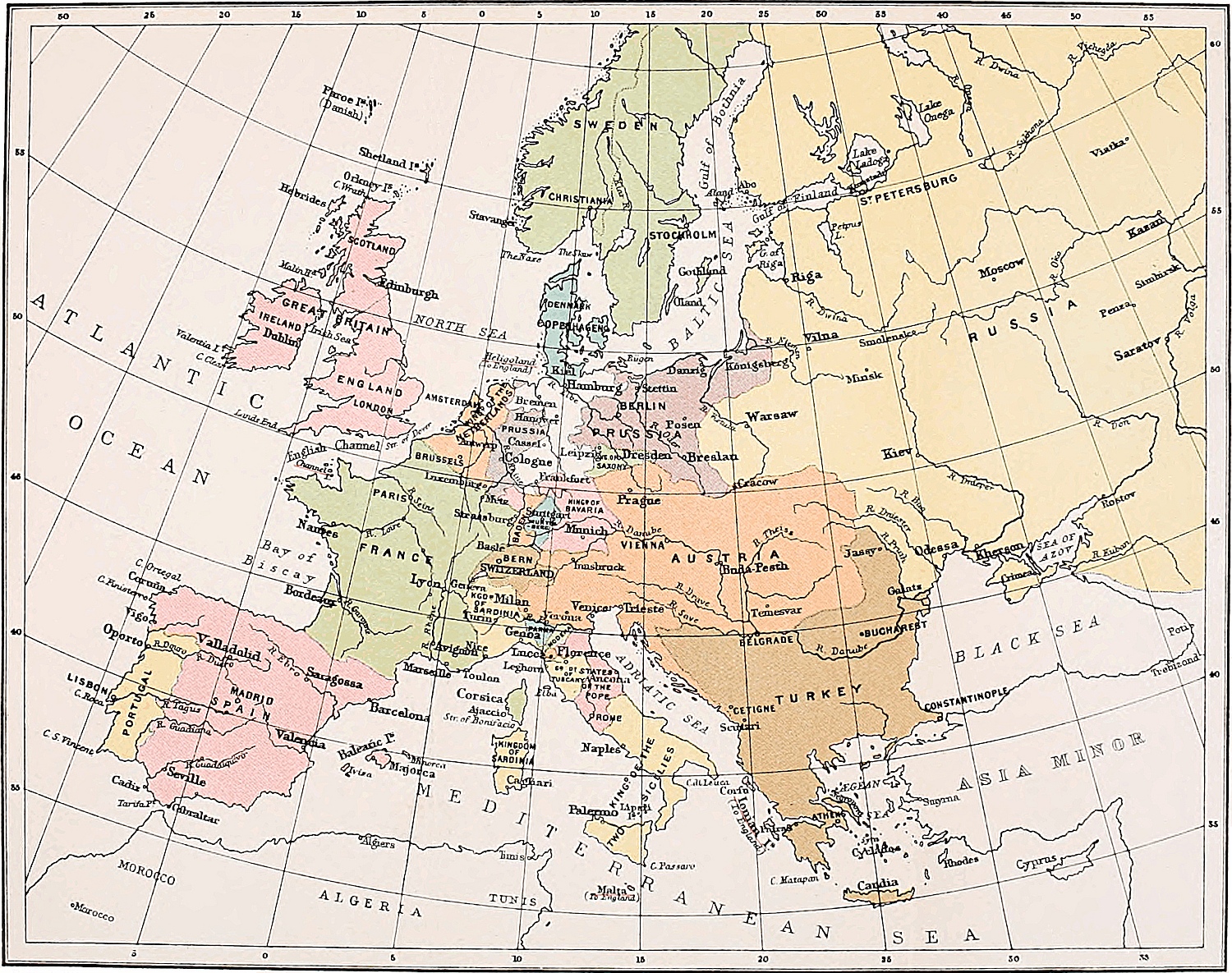 The rest of the European states were bound more or less firmly to the one or the other of the two coalitions. The smaller states of Germany, aggravated or intimidated by the measures of the Emperor Joseph II., had rallied to the side of Prussia. In the north, Denmark, whose reigning house was connected by family ties with the royal families of England and Prussia, was completely under Russian influence, while Sweden, under Gustavus III.,14 was actually at war with Catherine II. Poland, torn by internal dissensions, and threatened with complete destruction by its neighbours, was awaiting its final partition. The southern states of Europe were almost entirely bound to the Franco-Austrian alliance. Spain had been united to France by the offensive and defensive treaty, known as the ‘Pacte de Famille,’ concluded by the French minister, Choiseul, in 1761, and tested in the war of American Independence. Portugal, though connected with England, commercially by the Methuen treaty, and politically by a long course of protection against Spanish pretensions, was striving by a series of royal marriages to become the ally of Spain. In Italy, Naples was ruled by a Spanish prince married to an Austrian princess; Sardinia was closely allied with France, and the remainder of the peninsula was mainly under Austrian influence. Turkey, now travelling towards decay, was looked upon by Russia and Austria as their legitimate prey, and met with encouragement in resistance, but not with active help, from England and France.