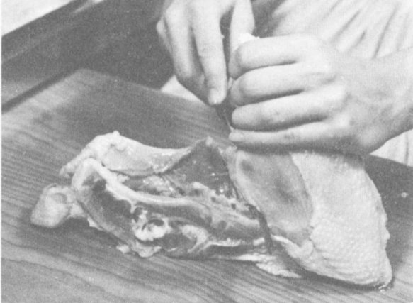Cut up poultry (p. 16). Remove bone—but not skin—from meaty pieces either before or after precooking.