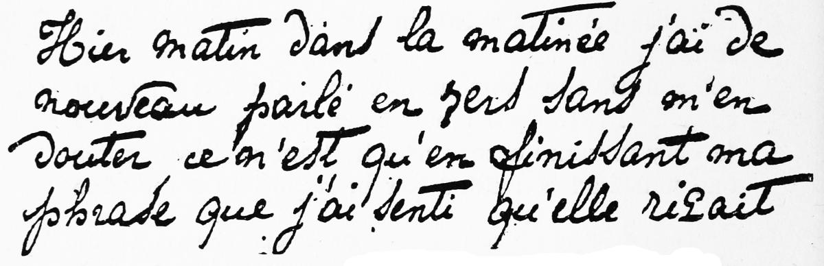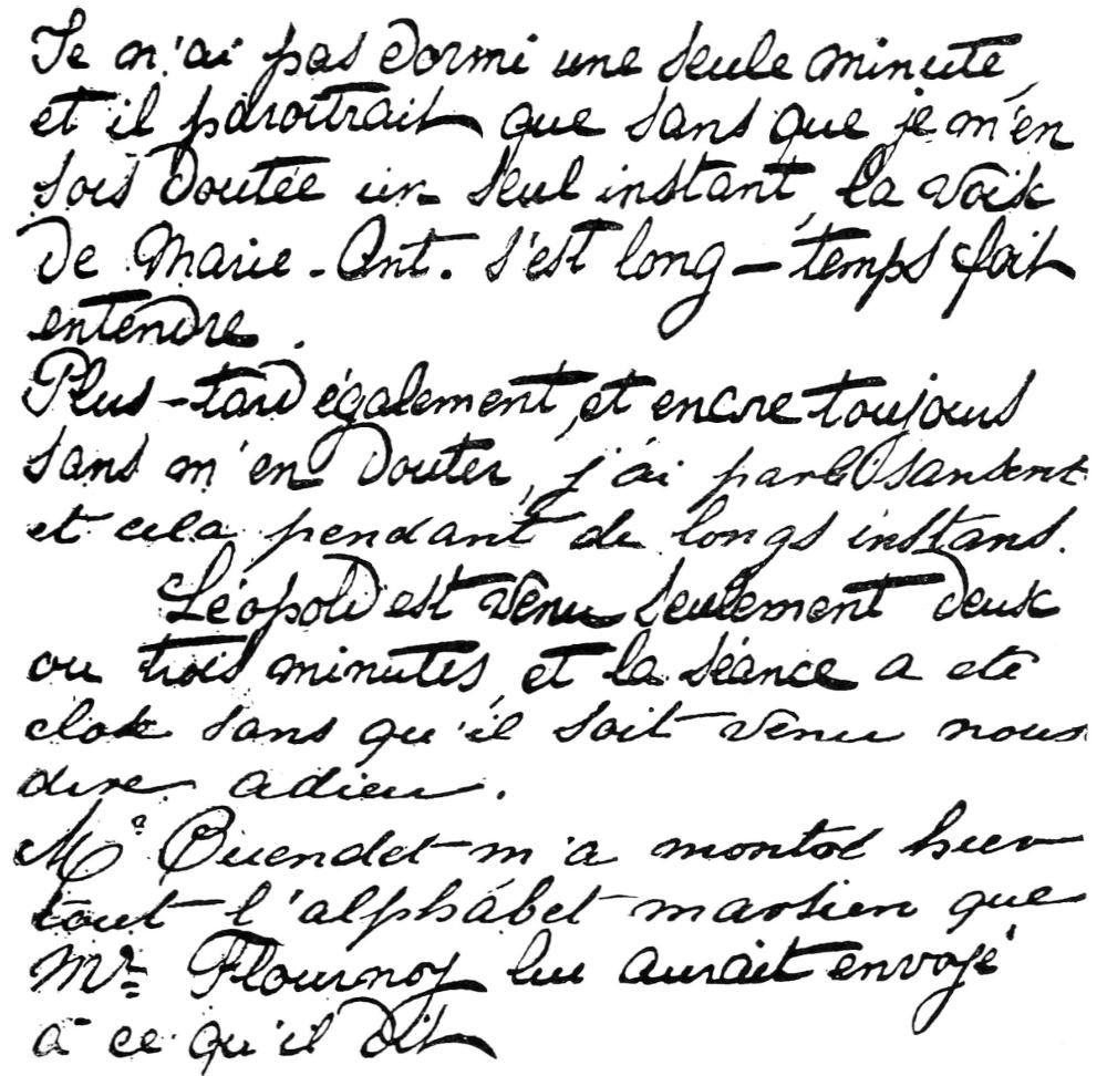 Two weeks later I made a visit to Mme. and Mlle. Smith—there was no seance held—when Hélène suddenly assumed the voice and accent of Leopold, without being aware of the change, and believing me to be joking when I sought to cause her to notice it. Presently the hemisomnambulism becomes accentuated; Hélène sees the vision of the other day, the village and then the little old man (the syndic) reappear, but the latter is accompanied this time by a curé with whom he seemed on good terms and whom he called (which she repeats to me all the while with Leopold’s Italian accent), “My dear friend Burnier” As I ask whether this curé could not write his name with Hélène’s hand, Leopold promised me by a digital dictation that I should have that satisfaction at the next seance; then he begins to talk to me of something else by Hélène’s mouth, she being now entirely entranced.