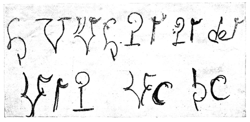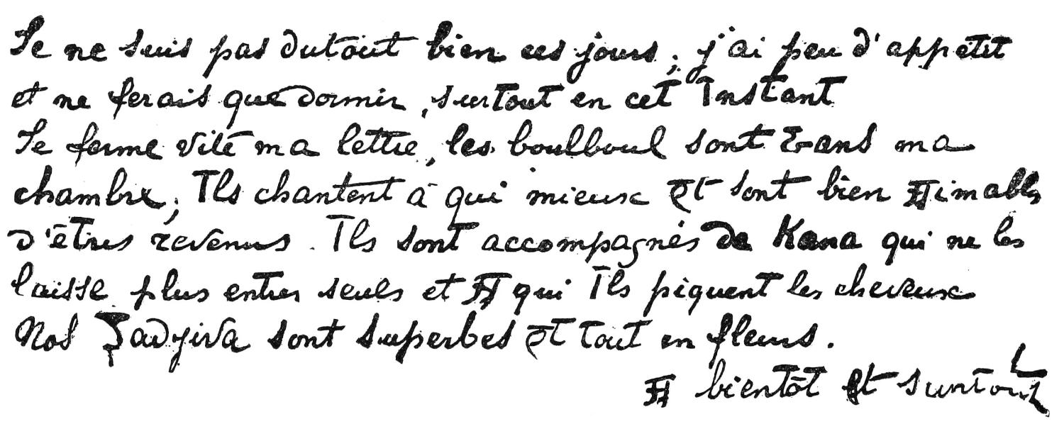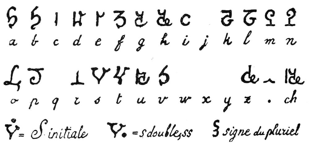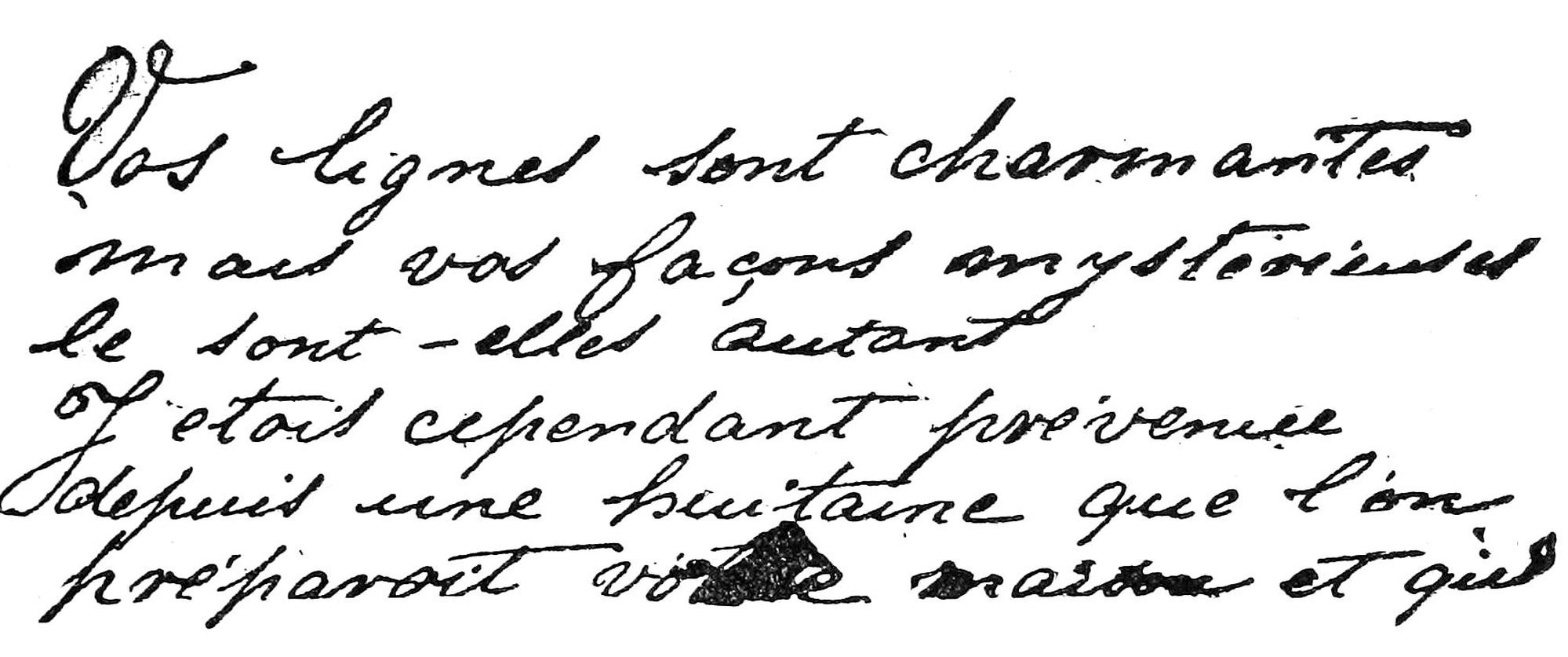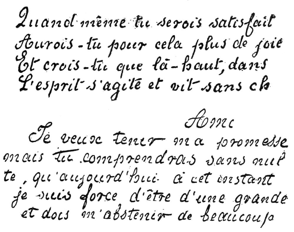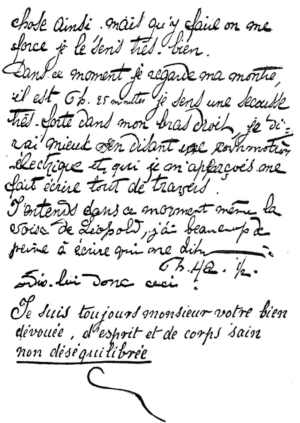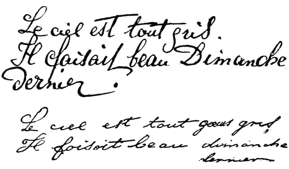 [28] I have respected the orthography as well as the complete absence of punctuation of this bit of automatic writing, confining myself to marking by vertical bars its evident separation into verses of eight feet. It is written in the inclined and regular hand called that of Marie Antoinette (like that of Fig. 40), but with a pencil too pale to permit its reproduction.