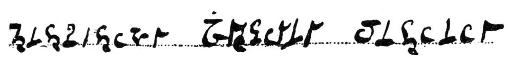 In a seance at my house (February 12, 1899), Mlle. Smith has a vision of a village on a height covered with vines; by a rocky road, she sees descending from it a little old man, who has the air of a quasi gentleman; he wears shoes with buckles, a large felt hat, the collar of his shirt is unstarched, and has points reaching up to his cheeks, etc. A peasant in a blouse, whom he meets, makes reverences to him, as to an important personage; they speak a patois which Hélène does not understand She has the impression of being familiar with the village, but vainly searches her memory to discover where she has seen it. Presently the landscape fades away, and the little old man, now clothed in white and in a luminous space (i. e., in his actual reality of a disincarnate), appears to draw near to her. At this moment, as she leans her right arm upon the table, Leopold dictates by the index-finger: “Kiss her arm.” I execute the order; Hélène’s arm at first resists strenuously, then yields suddenly. She seizes a pencil, and in the midst of the customary struggle relative to the manner of holding it (see p. 100), “You are holding my hand too tightly,” says she to the imaginary little old man, who, according to Leopold, wishes to make use of it in order to write. “You hurt me very badly; do not hold it so firmly.... What difference does it make whether433 it is a pencil or a pen?” At these words she throws away the pencil and takes up a pen, and, holding it between the thumb and index-finger, slowly traces in an unknown hand: “Chaumontet, syndic” (see Fig. 44).