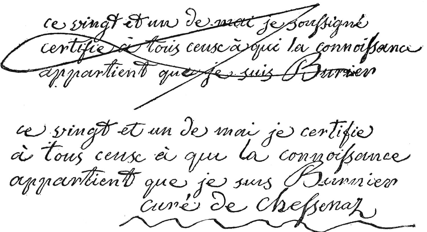 My first idea was, as may be supposed, that Mlle. Smith must some time or other have seen some certificates or documents signed by the syndic or by the curé of Chessenaz, and that it was these forgotten436 visual flashes, reappearing in somnambulism, which had served her as inner models when her entranced hand retraced these signatures. One may likewise imagine how angry such a supposition would make Hélène, who has no recollection whatever of having ever heard the name of Chessenaz nor of any of its inhabitants, past or present. I only half regret my imprudent supposition, since it has availed to furnish us a new and more explicit manifestation of the curé, who, again taking hold of Mlle. Smith’s arm at a later seance (May 21st, at M. Lemaître’s) comes to certify to us as to his identity by the attestation, in due and proper form, of Fig. 43. As is there seen, he makes it twice; being deceived as to the signature, he incontinently, with disgust, crosses out that which he had so carefully written, and recommences on another sheet; this second draft, in which he has omitted the word “soussigné” (“undersigned”) of the first, took him seven minutes to trace, but leaves nothing to be desired as to precision and legibility. This painstaking calligraphy is very like that of a country curé of sixty years ago, and in default of another specimen for comparison, it presents an undeniable analogy of hand with the authentic receipt of the order for payment of money of Fig. 44.