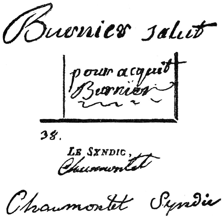 At the following seance at my house (the 19th of March), I remind Leopold of his promise. He answers at first by the finger: “Do you very much desire that signature?” and it is only upon my insisting435 that he consents. Hélène then is not long in again seeing the village and the curé, who after divers incidents takes hold of her hand as the syndic had done, and traces very slowly with the pen these words, “Burnier greets you” (Fig. 44); then she passes into other somnambulisms. The moment had arrived to clear up the matter. I wrote at hazard to the mayor’s office at Chessenaz. The mayor, M. Saussier, had the kindness to answer without delay: “During the years 1838-39,” stated he to me, “the syndic of Chessenaz was a Chaumontet, Jean, whose signature I find attached to divers documents of that period. We also had as curé M. Burnier, André, from November, 1824, up to February, 1841; during this period all the certificates of births, marriages, and deaths bear his signature.... But I have discovered in our archives a document bearing both signatures, that of the syndic Chaumontet and that of the curé Burnier. It is an order for the payment of money. I take pleasure in transmitting it to you.” I have caused to be reproduced in the middle of Fig. 44 the fragment of this original document (dated July 29, 1838), bearing the names of these two personages; the reader can thus judge for himself in regard to the quite remarkable similarity which there exists between these authentic signatures and those automatically traced by the hand of Mlle. Smith.