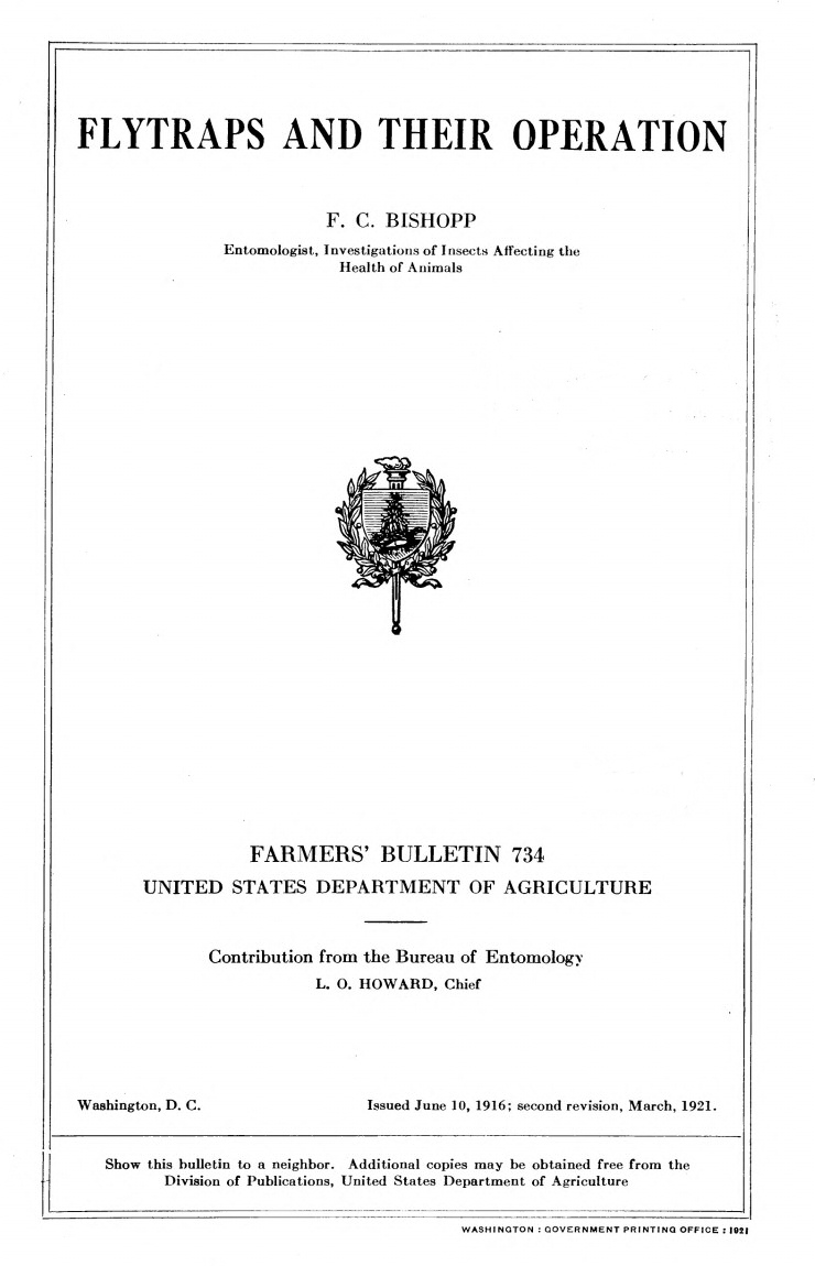 In many cases flytrapping has been rendered ineffectual by the fact that the traps were not properly cared for. In setting traps a location should be chosen where flies naturally congregate. This is usually on the sunny side of a building out of the wind. It is exceedingly important that the bait containers be kept well filled. This usually requires attention every other day. The bait pans should be washed out at rather frequent intervals. This gives a larger catch and avoids the danger of flies breeding in the material used for bait. Further, it should be borne in mind that traps can not be operated successfully throughout the season without emptying them. Where flies are abundant and the bait pans are properly attended to the traps should be emptied at weekly intervals. Where flies become piled high against the side of the cone the catching power of the trap is considerably reduced. The destruction of the flies is best accomplished by immersing the trap in hot water or, still better, where a tight barrel is at hand place a few live coals in a pan on the ground, scatter two tablespoonfuls of sulphur over them, place the trap over the coals, and turn the barrel over the trap. All of the flies will be rendered motionless in about five minutes. They may then be killed by using hot water, throwing them into a fire, or burying them. In the operation of flytraps in controlling the screw-worm it has not been found necessary, especially during hot weather, to kill the flies, as they die very rapidly within the traps. In order to empty a trap it may be inverted and the dead flies shaken down. As the living flies will naturally go upward, the door may [ 16 ] then be removed and the dead flies shaken out, the door replaced, and the trap set upright without loss of many of the living flies.