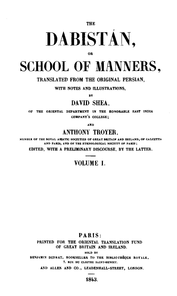 We may suppose it was upon the recommendation of sir William Jones, that Francis Gladwin, one of the most distinguished members of the new Society, translated the first chapter of The Dabistán, or “School of Manners,” which title has been preserved from due regard to the meritorious Orientalist, who first published the translation of a part of this work. The whole of it was printed in the year 1809, in Calcutta, and translations of some parts of it were published in The Asiatic Researches.[10] It is only at present, more than half a century after the first public notice of it by sir W. Jones, that the version vii of the whole work appears, under the auspices and at the expense of the Oriental Translation Committee of Great Britain and Ireland.