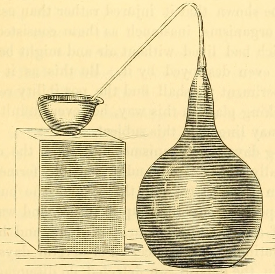 “Experiments on Germinated Barley.—The object of these was to show that, when barley, left to itself in sweetened water, produces in succession alcoholic, lactic, butyric, and acetic fermentations, these modifications are brought about by ferments which are produced inside the grains themselves, and not by atmospheric germs. More than forty different experiments were devoted to this part of my work.” Need we add that this assertion is based on no substantial foundation? The cells belonging to the grains of barley, or their albuminous contents, never do produce cells of alcoholic ferment, or of lactic ferment, or butyric vibrios. Whenever those ferments appear they may be traced to germs of those organisms, diffused throughout the interior of the grains, or adhering to their exterior surface, or existing in the water employed, or on the sides of the vessels used. There are many ways of demonstrating this, of which the following is one: since the results of our experiments have shown that sweetened water, phosphates, and chalk very readily give rise to lactic and butyric fermentations, what reason is there for supposing that if we substitute grains of barley for chalk, the lactic and butyric ferments will spring from those grains, in consequence of a transformation of their cells or albuminous substances? Surely, there is no ground for maintaining that they are produced by hemi-organism, since a medium composed of sugar, or chalk, or phosphates of ammonia, potash, or magnesia contains no albuminous substances. This is an indirect but irresistible argument against the hemi-organism theory.