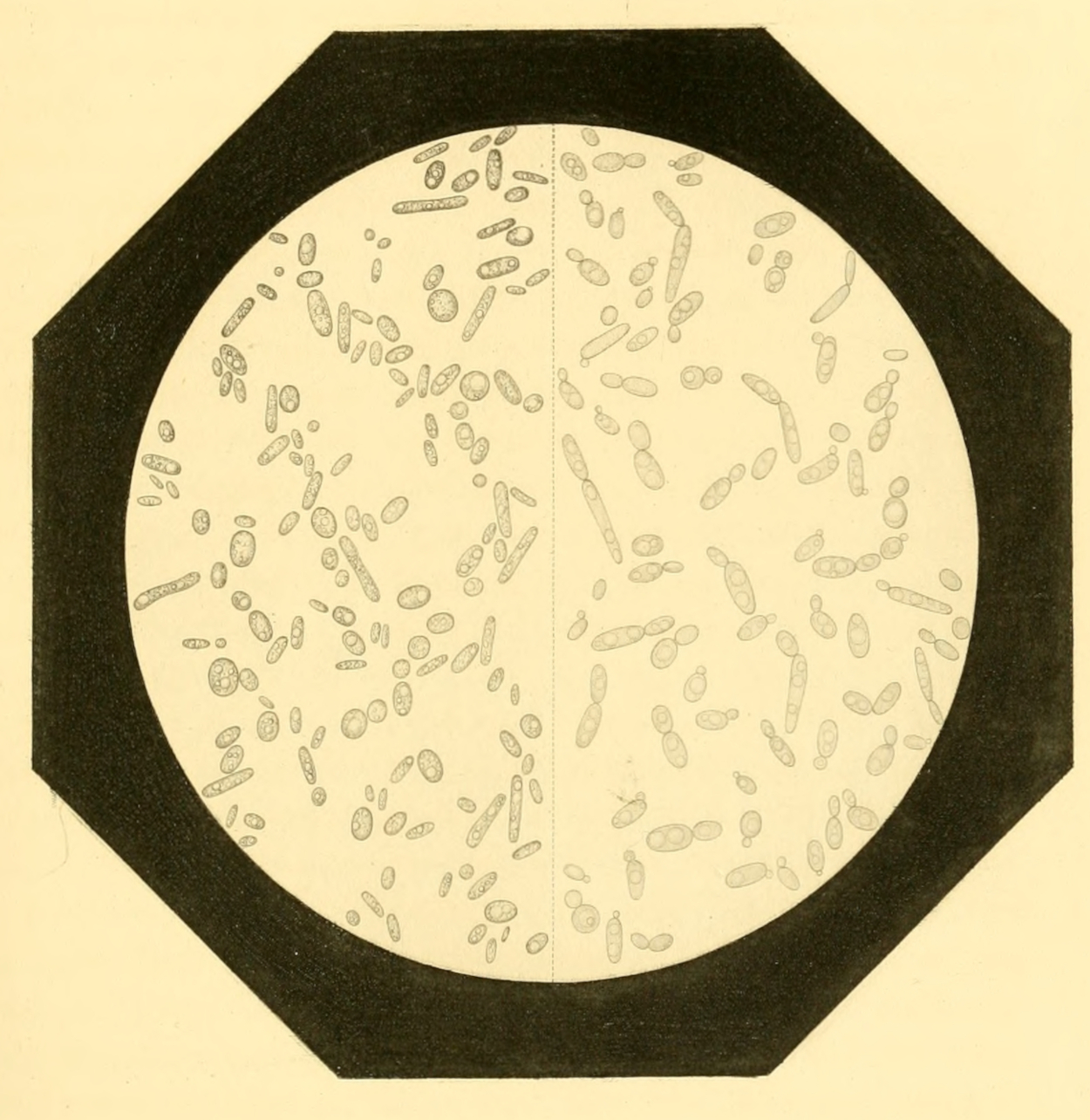 IV. Mycoderma vini functioning as an alcoholic ferment.—Right half, showing appearance of spores just sown; left half, their appearance after an interval of submerged life 116