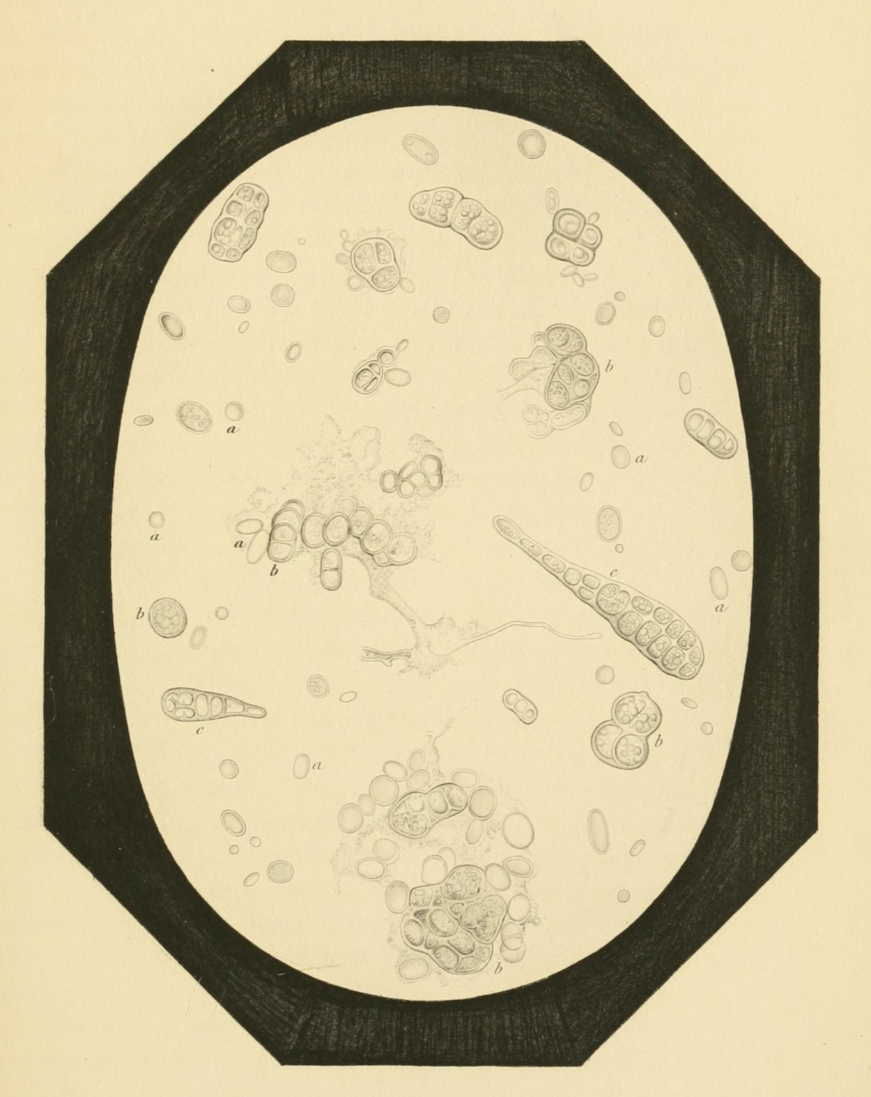 5No. 1 of the engraving represents the ferments of turned beer, as it is called. These are filaments, simple or articulated into chains of different size, and having a diameter of about the thousandth part of a millimetre (about 1/25000 inch). Under a very high power they are seen to be composed of many series of shorter filaments, immovable in their articulations, which are scarcely visible.