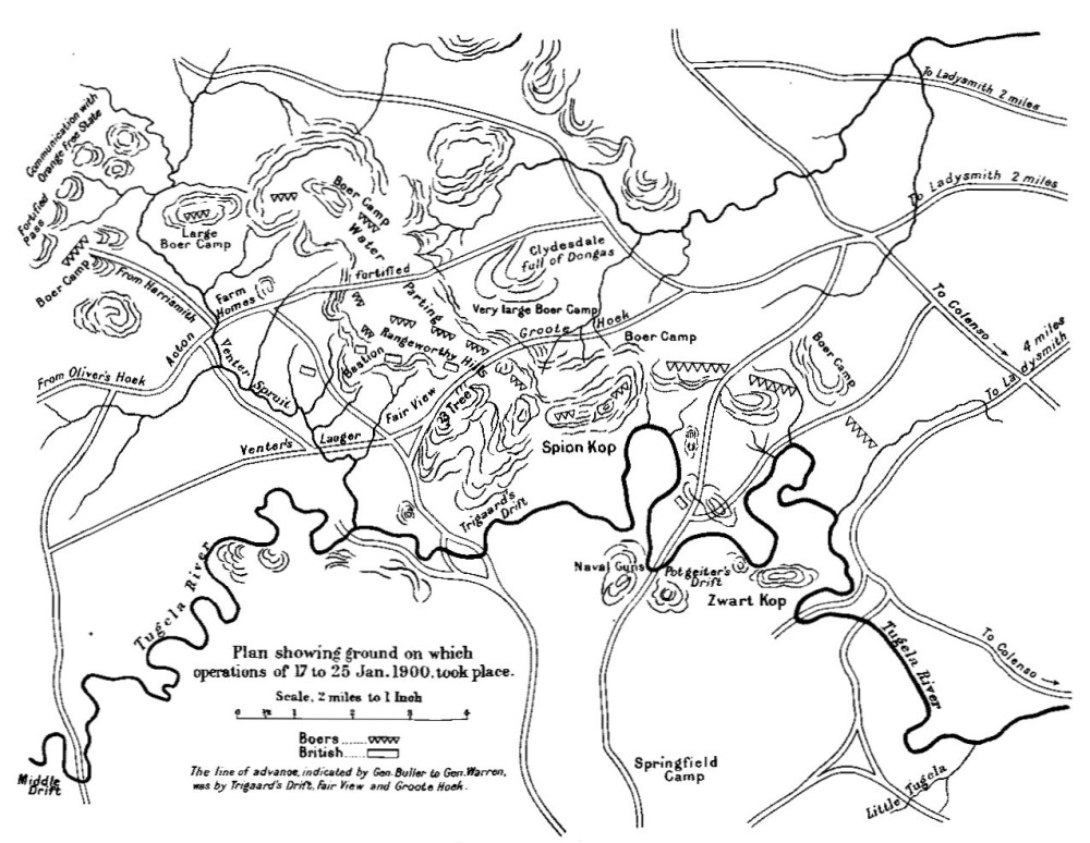 In addition to the official documents on the subject of Spion Kop much information of a very varied character has accumulated during the last two years, and besides invaluable verbal observations and descriptions gathered from conversation with officers from the front who took part in the operations, there is a whole library of books by newspaper correspondents, officers, and others, which bear upon these operations and throw light upon much that is obscure in the official papers. Among many others may be mentioned ‘My Diocese during the War,’ by Bishop Baynes of Natal; ‘The Relief of Ladysmith,’ by Mr. J. B. Atkins; ‘The Natal Campaign,’ by Mr. Bennet Burleigh; ‘London to Ladysmith via Pretoria,’ by Mr. Winston Churchill, M.P.; ‘The History of the War in South Africa,’ by Dr. Conan Doyle; ‘The Relief of Ladysmith,’ by Captain Holmes Wilson; ‘Buller’s Campaign: With the Natal Field[xvii] Force of 1900,’ by Lieutenant E. Blake Knox, Royal Army Medical Corps.