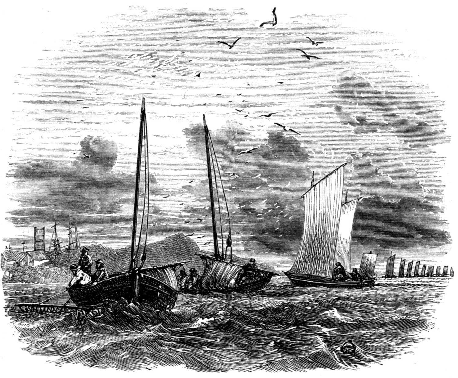“Each yawl, varying in tonnage from 28 to 45 tons, costs from £600 to £650, and is divided into shares; of its earnings 3s. 6d. in the pound are paid to the owner or owners, 10s. are devoted to the current expenses, and the remainder is divided among the men who find the bait. When a new boat is required, several persons—gentlemen speculators, harbour-masters, etc., and boatmen—take certain shares of it, which vary in amount from a half-quarter to a half of the cost; application is then made to a builder, sail-maker, anchor-maker, and other tradesmen; and the vessel, in due time, is paid for, equipped, and given over to the owners. Each lugger-yawl carries two masts, and is provided with three sets of sails to suit various states of weather. The foresail contains 200 or 250 yards, the mizen 100, and the mizen-topsail 40 yards; the lesser sizes being severally of 100, 60, and 50 yards. The jib is very small. On the average the yawl is of 40 tons, and measures 51 feet keel, or 55 feet over all, and is of 17 or 18 feet beam; drawing 6½ feet water aft, and 5 feet forward. The amount of ballast varies from 20 to 30 tons. The yawl is provided with 120 nets, each of which costs £30. Half of this number are left on shore, and changed at the end of every 12 weeks. The crew is composed of 7 men and 2 boys. For instance, the ‘Wear,’ commanded by Colling, a first-rate seaman, carries two others, like himself part-owners, 4 men receiving, besides their food, £1, and 1 boy at 18s., and another at 11s. a week; each fisherman, who is a net-owner, receives 24s. a week. The expenses in wages and wear and tear are calculated at from £12 to £15 weekly. The herrings are valued at £2 per 1000 on an average. Sometimes 23,000 fish are caught in a single haul, occasionally as many as 60,000, but 40,000 are considered a good catch. To remunerate the crew, £50 or £60 a week ought to be obtained. Each net is 10 fathoms long, and is sunk 9 fathoms during the fishing, the upper part being floated by a long series of barrels, which are fitted at intervals of 15 fathoms. The warps used for laying out the nets in each vessel measure 2200 yards. Two men take up the nets, two empty the fish out of them, and one boy stows the nets while his fellow stows the warps, which are raised by a windlass worked by the men. Each net weighs about 28 pounds. In order to preserve the nets and sails, it is necessary at frequent intervals to cover them with tanning, which is prepared in large coppers. These coppers cost £40.”