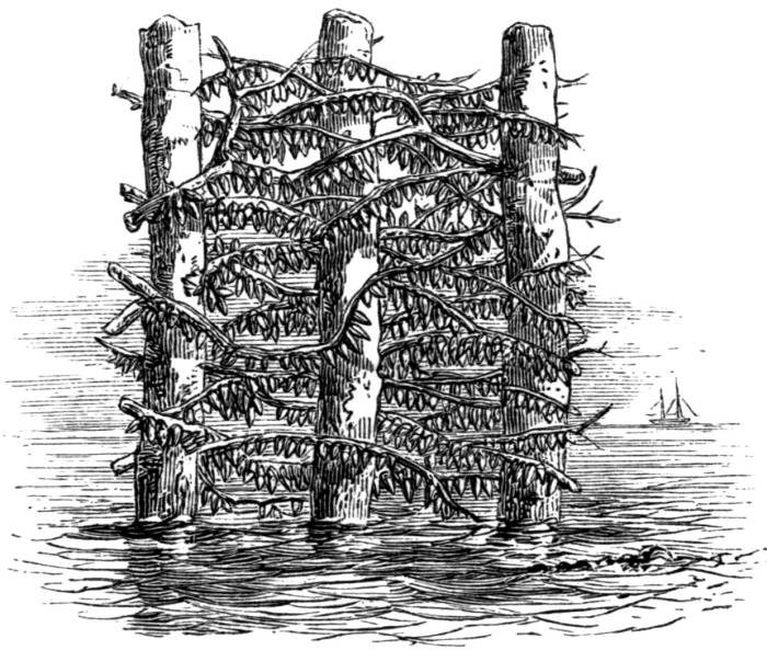[14] Mr. Ashworth, in a communication to Mr. Barry, one of the Commissioners of Irish Fisheries, says: “No charge is made for the oyster-parks, but each plot is marked and defined on a map, and the produce is considered to be the private property of the person who establishes it. They vary in size twenty or thirty yards square, the stone or tiles are placed in rows about five feet apart, with the ends open so as to admit of the wash of the tide in and out.”