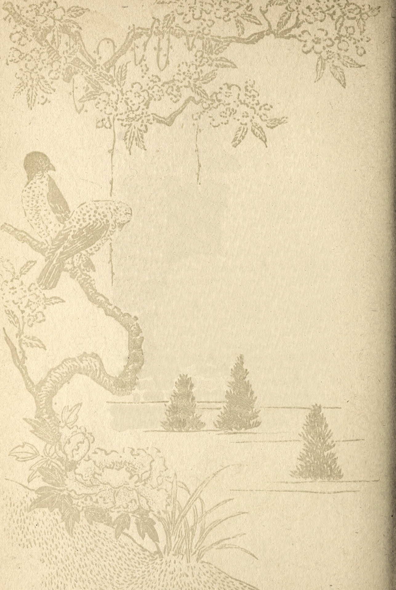 A few days later. It is early evening and the crickets are making a great bustle in the grasses, while a small, gray ape, swinging in a bamboo, is mingling its chattering with the cawing of the crows in the camphor-trees.