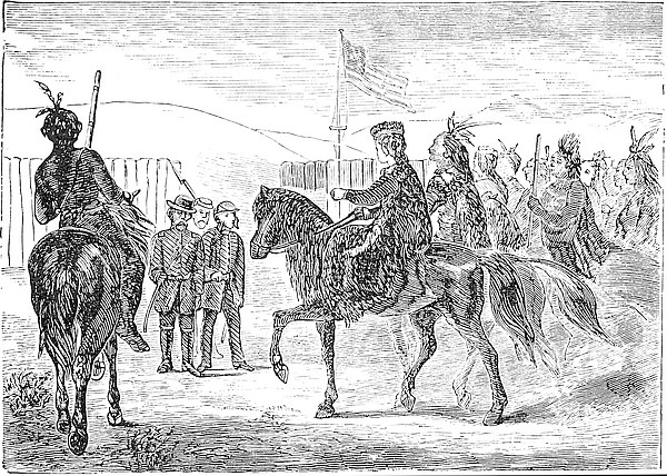 But no attack was made. The Indians seemed to know that the little band of soldiers were prepared, and went quietly into camp, on an island opposite the267 fort. Next day a council was held, and the terms of the captives surrender agreed upon. Three unserviceable horses, to replace ponies left with the Ogalallas by the Blackfeet, as a pledge for the captives return; also, fifty dollars worth of presents, some provisions, and a promise of a treaty when General Sully should return. The Indians remained about the fort nearly two weeks, and during that time efforts were made to induce the captive woman to leave the fort and visit them at their lodges, doubtless with the design of recapturing her. After making the captive some presents, they bade adieu. Two months later they returned, apparently very much disappointed when they found the captive had left for her home. They were soon again upon the war path.