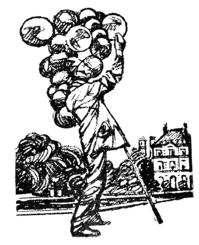 [p. 66] Rogers est astigmate, il a deux grosses lunettes d’or à verres dissemblables et il vous pose toujours, aussi, deux questions différentes à la fois. Oui, je l’ai vu. Une fois, au Luxembourg, l’été: il entrait dans le jardin irréel, peuplé de Parisiens fantasques et tendres, et ceux qui se sentaient trop lourds pouvaient acheter de petits ballons à la porte. Une autre fois, chez un ami qu’il avait recherché l’avant-veille, sans le trouver, et il avait laissé un distique,—la veille, et il avait laissé un sonnet. Mon ami se laissa surprendre au lit le troisième jour, sinon il aurait eu au moins une ballade.