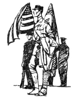 La manœuvre commençait. La compagnie des signaleurs nous prévint qu’une guerre était déclarée. Aussitôt les quatre lignes de la compagnie Mills, ouvertes à larges espaces, s’emboîtèrent dans les quatre lignes Size et tournèrent en sens inverse. La T.S.F. nous indiqua l’arrivée des uhlans. Aussitôt, entre deux sections au repos, les six autres formèrent chacune une lettre du mot France. Puis elles défilèrent, le drapeau les précédant. Ce jour-là encore il avait une étoile de plus qu’il n’était mort d’Américains pour la France, étoile masquée de soie bleue que le porte-étendard, chaque matin, en ouvrant le journal, tremblait non sans espoir d’avoir à délivrer; et pour la première fois le drapeau américain me fit un salut personnel, il s’inclina, et surpris, confus, [p. 77] au lieu de saluer, je m’inclinai; et désormais nous nous connaissons, nous sommes amis. Puis, pour que la revue semblât sans fin et que les spectateurs dans leur esprit la vissent toujours continuer, les soldats disparurent noblement derrière un mamelon. Une fillette crut à un vrai départ et pleurait, appelant son frère.
