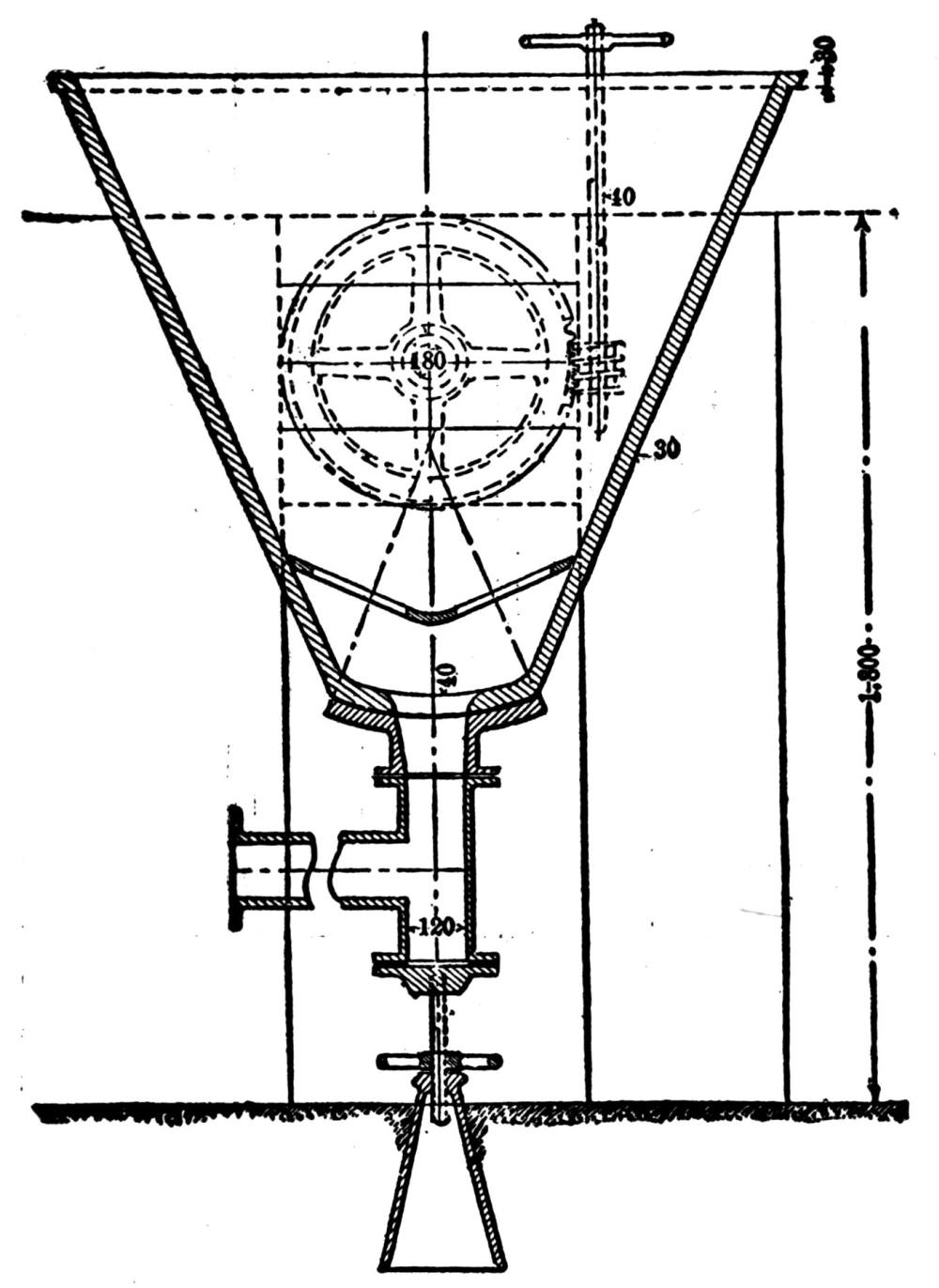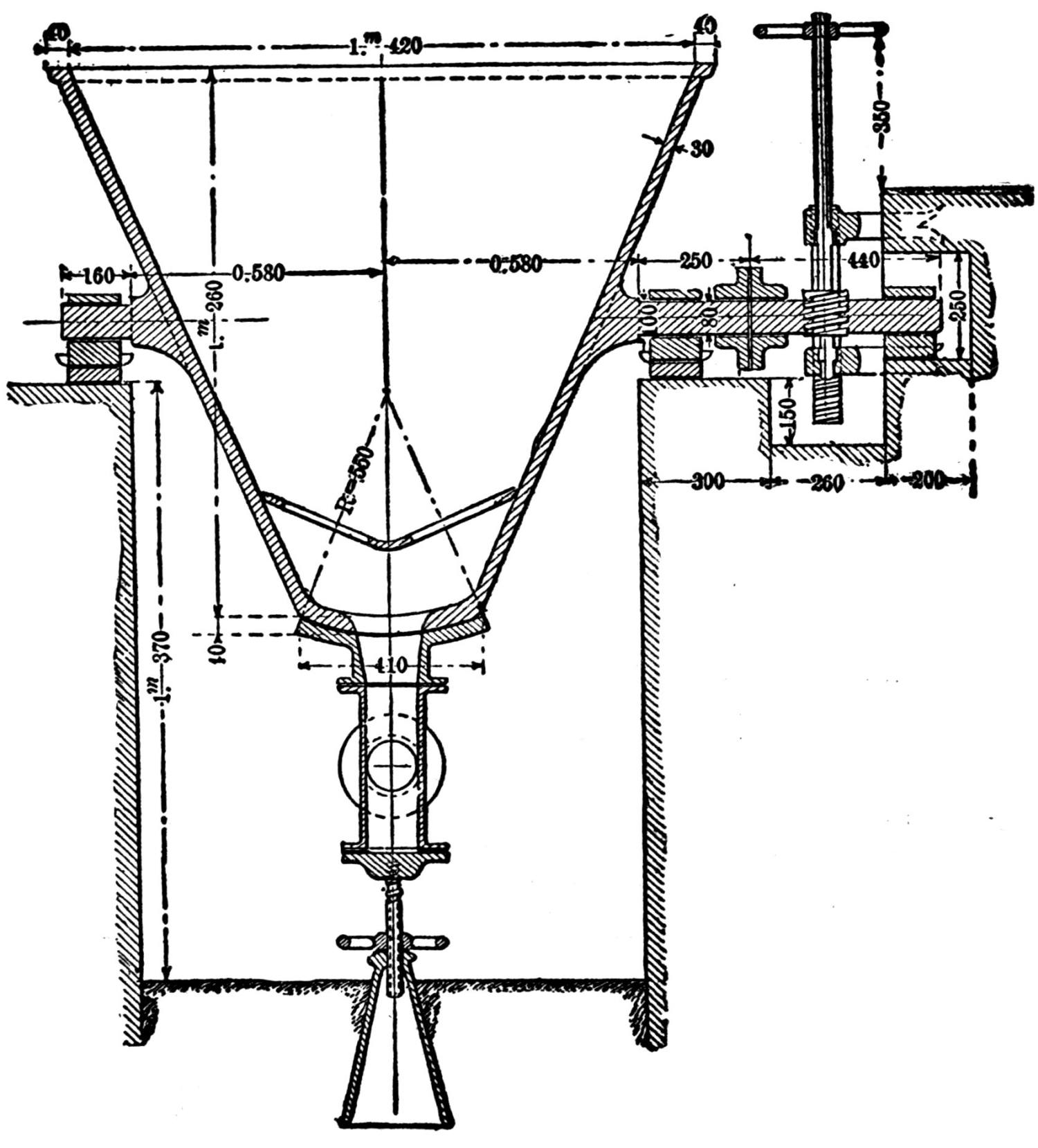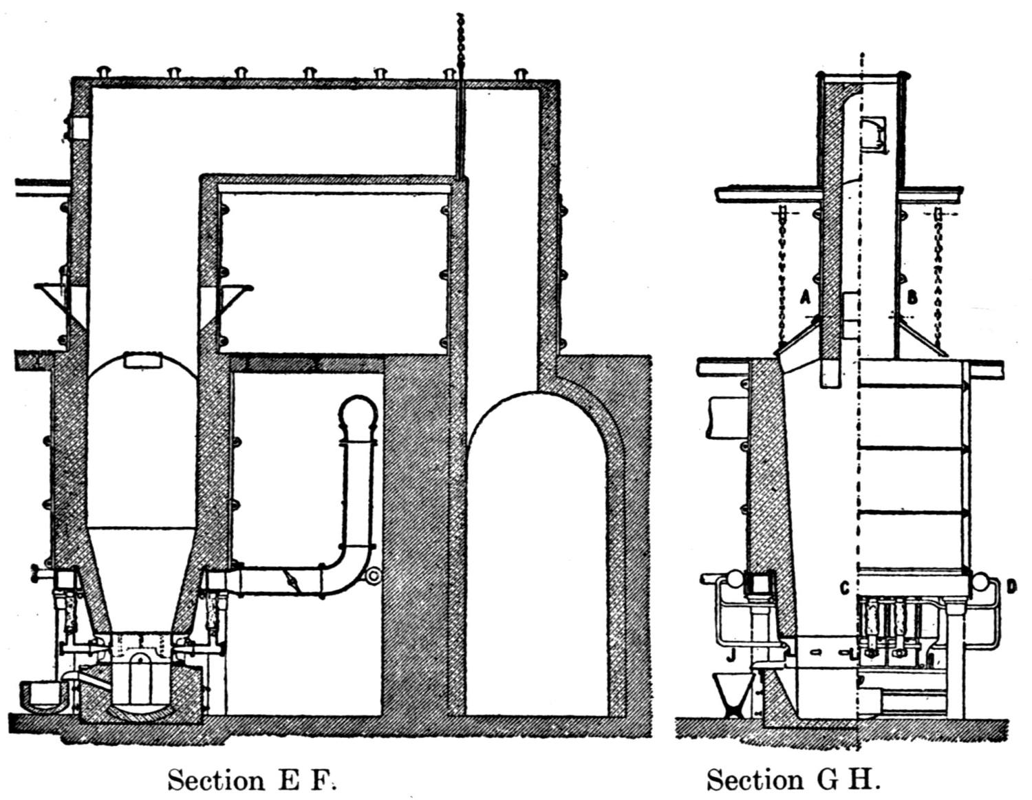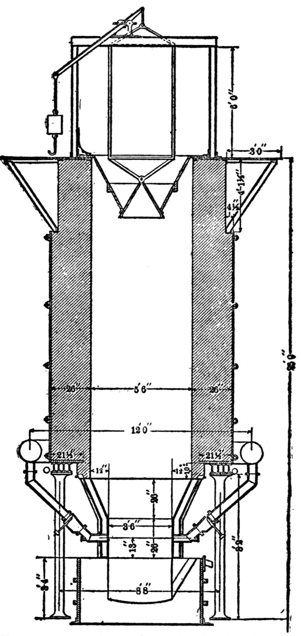 The chimney above the feed-floor covers one-third of the furnace shaft, and is turned down in the form of a siphon, to connect with the flue-dust chamber. The lateral faces, which are left open, serve as charging apertures; the central one of these, provided with a counterbalanced sheet-iron door, is used for charging from cars. The square openings at the ends, which are covered with cast-iron plates, are used for barring down the furnace shaft and may also be used for charging. By this arrangement, together with the two hoppers placed laterally on the chimney, it is possible to distribute the charge in any desired manner over the whole cross-section of the furnace. This arrangement greatly facilitates the removal of any accretions in the furnace shaft, as the centrally placed chimney catches all the smoke, while the charge-holes render the furnace accessible on all sides. In case of large accretions being formed, the whole furnace can be emptied, cleaned and restarted in 24 to 36 hours.