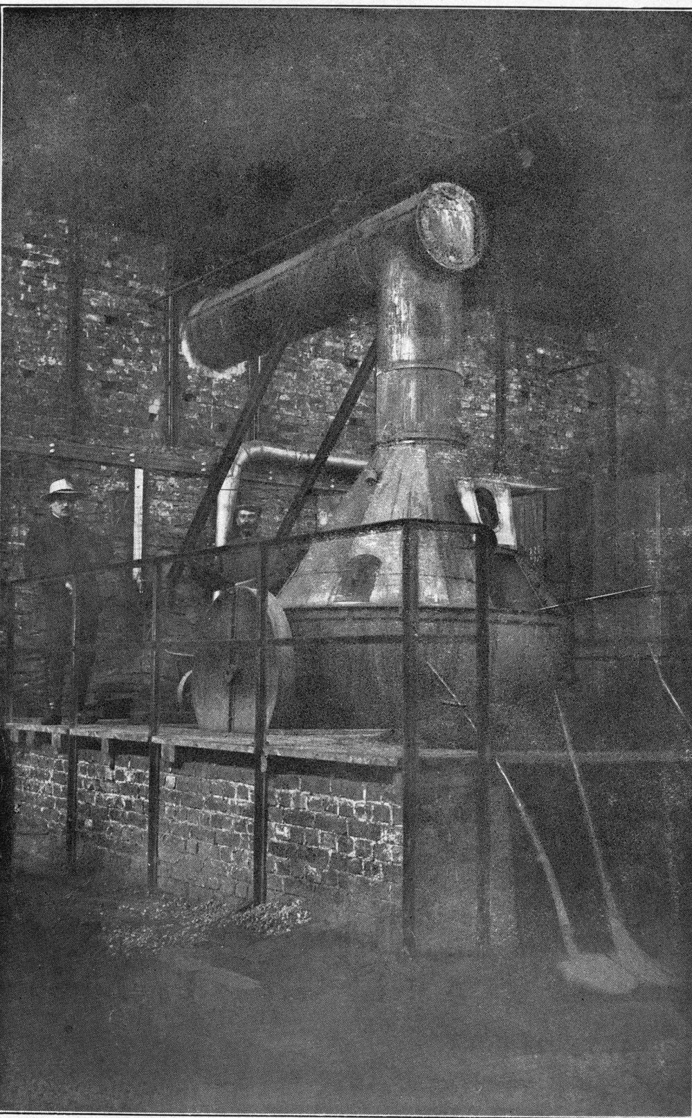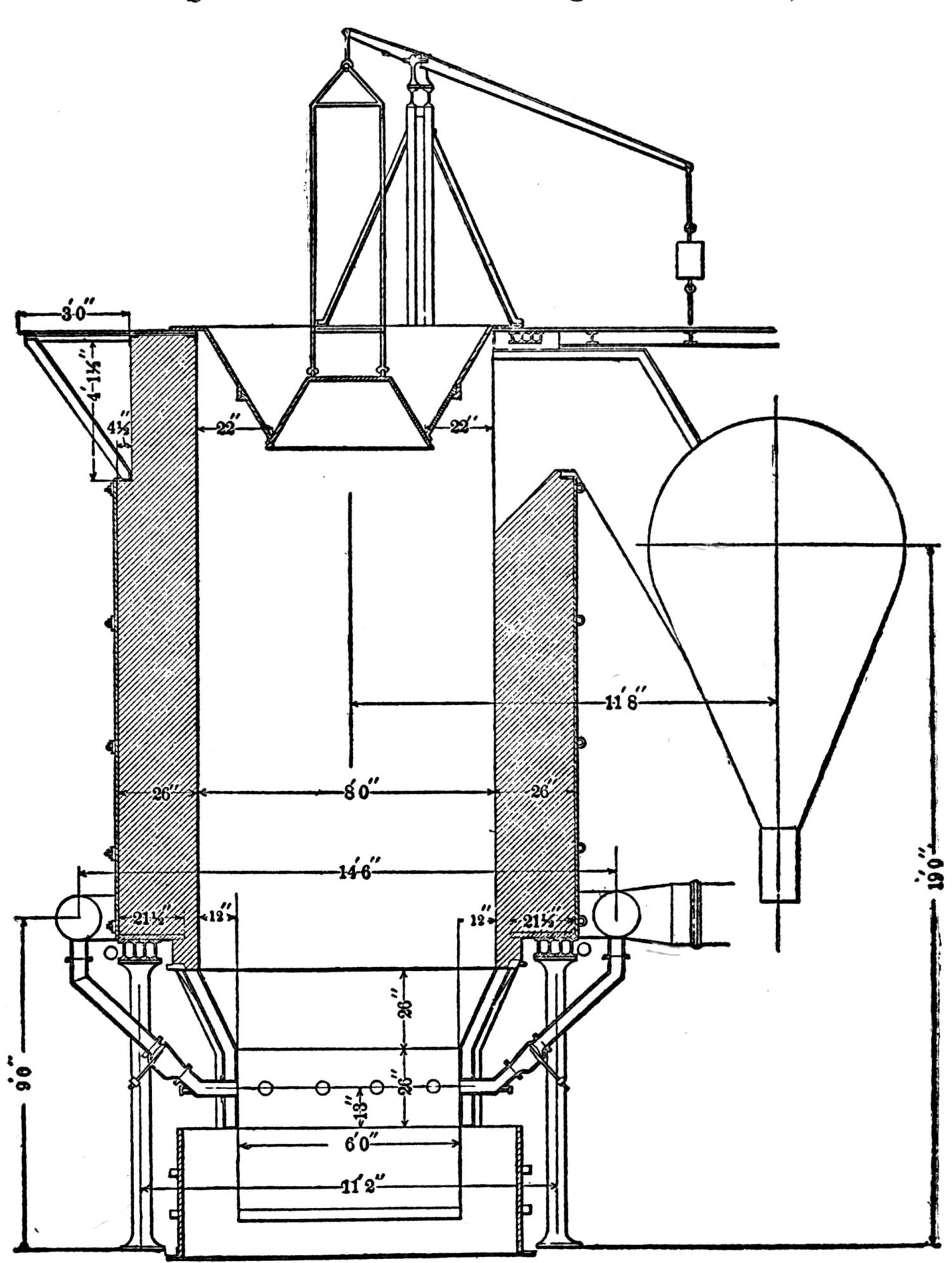 The furnace shaft is supported upon a hollow mantel, which serves at the same time as blast-pipe. The blast-pipe has eight lateral tees, which are connected by canvas hose with the eight tuyeres. The mouth of the tuyeres has the form of a horizontal slit, whereby the air is distributed more evenly over the entire zone of fusion.