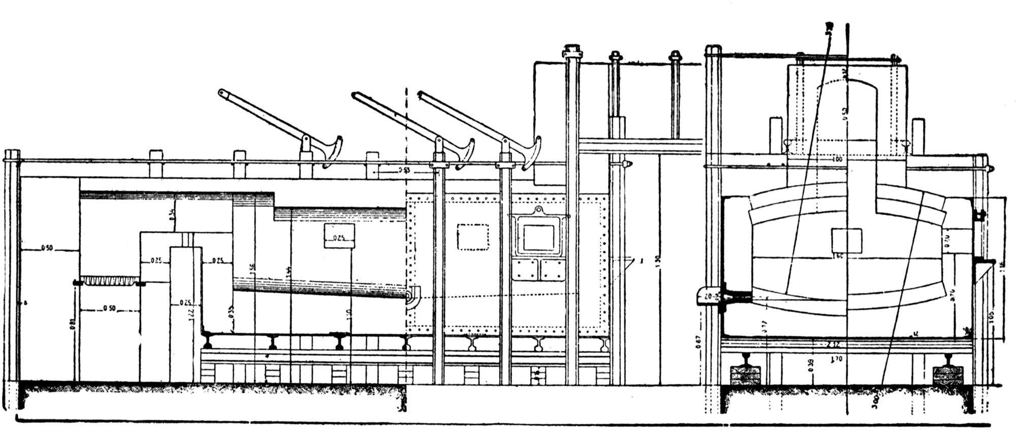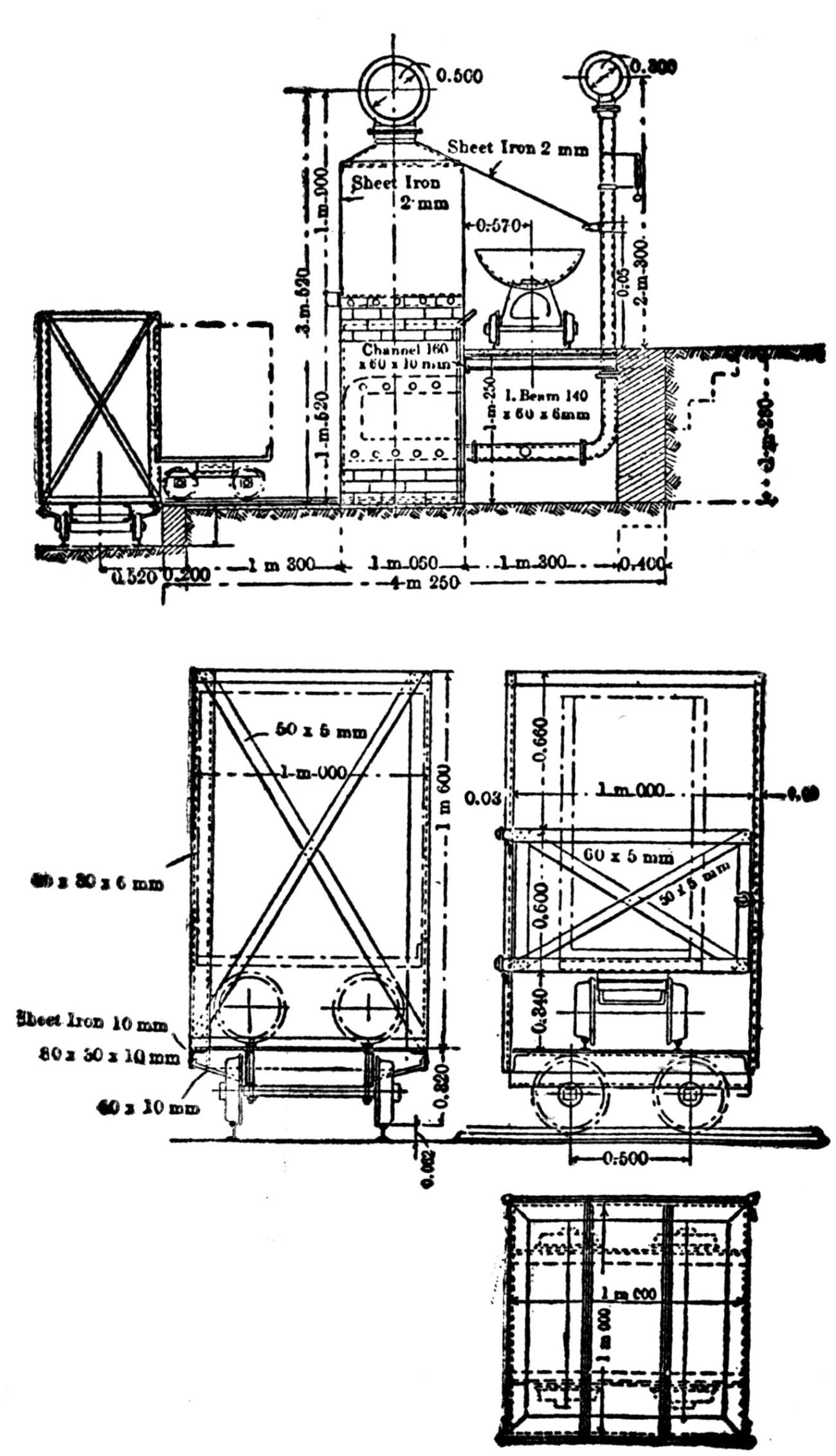 The hearth, cased with boiler plate and rails, has at the side a cast-iron pipe of 10 cm. diameter for drawing off the lead to the outside kettle; this pipe has a slight downward inclination, to prevent the slag flowing out; every 20 minutes lead is tapped, and the end of the pipe is then plugged up with clay.
