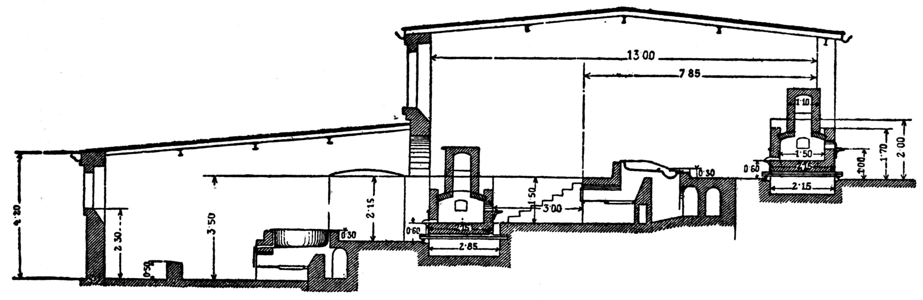As will be seen from the plan (Fig. 42), the smelting works cluster in terraces around the mine shaft, covering an area of about 3000 sq. m. (0.75 acre); the ore stocks and the pottery of the zinc works are located in separate buildings.