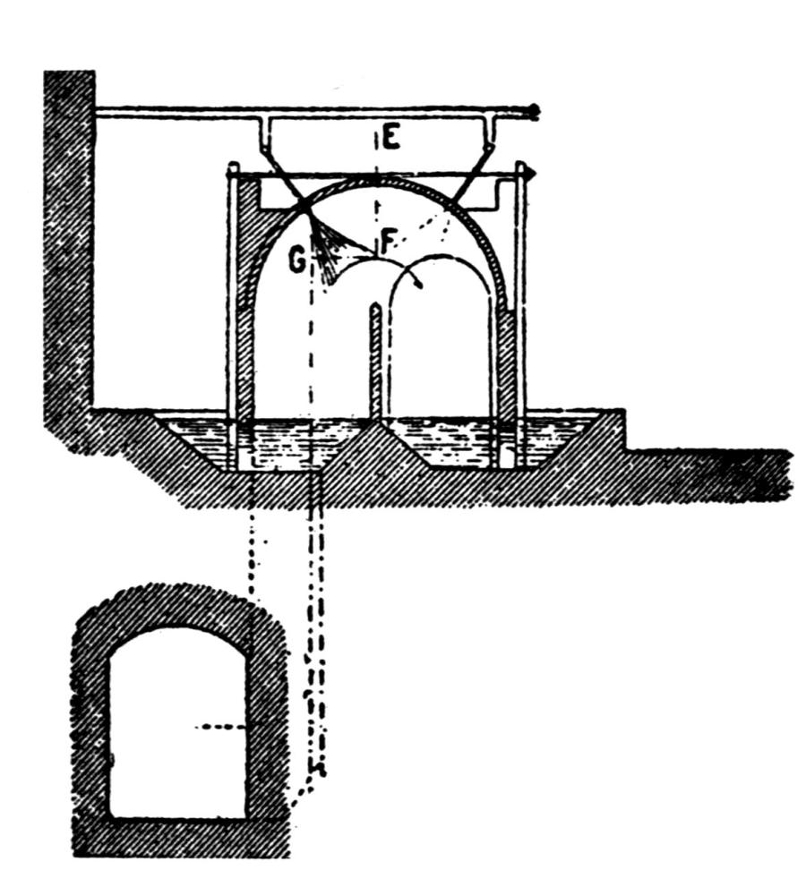 The precipitation of flue dust is effected in a brick condensing chamber, placed near the beginning of the main flue. The main flue terminates on the hill (see Fig. 43) in a chimney, the top of which is 160 m. above the ground level of the works, affording excellent draft. The condensing chamber (Figs. 49 to 51) consists of a vaulted room, 3.40 m. wide and 6.60 m. long, which is divided into twelve compartments by one longitudinal and five baffle walls. The gases change direction seven times, and pass over the longitudinal wall six times, being struck six times by fine sprays of water. The six atomizers for this purpose consume 1.5 liter of water per minute, of which four-fifths is vaporized, while one-fifth flows off to the lower water basin. By this means 10 to 15 per cent. of the total flue dust is precipitated in the condensing chamber itself, and is removed from time to time as mud through the lower openings, which are water-sealed. The remainder of the volatilized water precipitates the flue dust almost completely on the way to the stack, so that only a short column of steam is visible at the mouth of the stack. The flue to the stack passes for the most part underground through abandoned adits and galleries, thus providing a variety of changes in cross-section and in direction, and assisting materially the action of the condensing chamber.