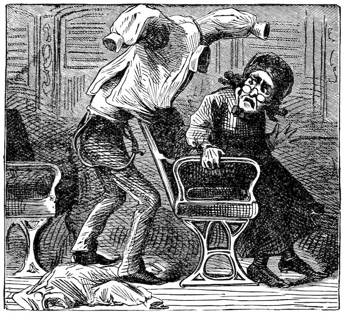 Besides, I saw his wife last evening with fully 516four yards of expensive satin trailing in the dust. It was my misfortune to be walking directly behind her. As the crowd was pressing me onward, I was obliged to dance a sailor’s hornpipe around the hall, in order to keep from treading upon her skirts. It needed not the grins of lookers-on to assure me that I was cutting a ridiculous figure.