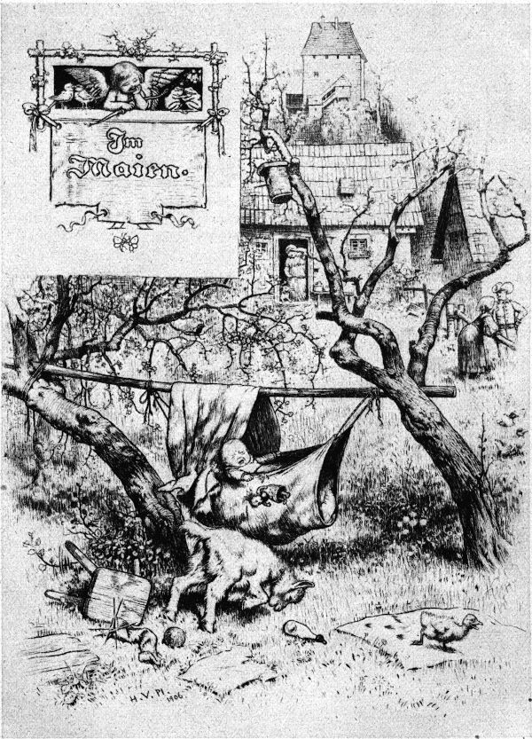 Dann erst wird uns Hermann Vogels künstlerische Bedeutung und Stellung noch viel eindrucksvoller zum Bewußtsein kommen, namentlich sein inneres Verhältnis zu Moritz v. Schwind und Ludwig Richter, seinen beiden »Kunstheiligen«, denen er auf dem Titelblatt seines Bilder- und Geschichtenbuches (vgl. Kunstwart-Heft vom April 1921), in gestaltenreichen Gedenkblättern und zahlreichen Märchenbildern gemütinnige Ehrenmale geschaffen hat. Bemerkenswerte Kunstbekenntnisse Hermann Vogels enthält auch ein Bild, auf dem er in die Rinde des Eichbaums deutscher Kunst, der von modernen Stürmern gefällt werden soll, folgende Namen eingeschrieben hat: Dürer, Holbein, Cornelius, Rethel, Moritz v. Schwind, Spitzweg und Ludwig Richter. Ferner sein Spruch, in dem er seinen Meister Schwind zur Deutschen Kunst sagen läßt: