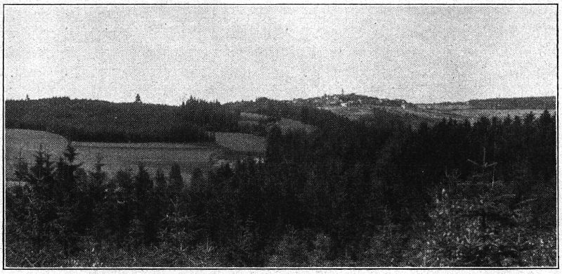 Übrigens ist auch der Kamm des Elstergebirges oberhalb Klingentals reich an Aussichtspunkten aller Art und hat auch einzelnen Gehöften Raum gegeben, sich da oben anzusiedeln, und man kann das weite Waldgebiet vom Kuhberg bei Schönheide aus stundenlang durchstreifen und findet immer wieder Punkte, die solche Wanderungen lohnend machen. Ganz einsam wird der Wald erst in der Gegend von Kottenhaide bei Schöneck, aber auch hier ist der Blick in das Waldgelände und über die Wipfel der Fichten anziehend genug, um die Beschwerden des Weges vergessen zu machen. Stundenlang schwellt ein weicher Moosteppich unter den Schritten des Wanderers, während der Kuckuck lockt und der Specht seine Schläge durch den Wald erschallen läßt. Wie ein fernes Sagen erklingt das Rauschen der Bäume und das Murmeln der Bäche, die hier oben zahlreich in dem Moore ihren Ursprung haben. Nur selten verhallt in der Ferne der Schrei einer Lokomotive, die keuchend das Muldental heraufkommt, um nach kurzer Zeit bei Schöneck wieder in weitem Bogen ins Tal hinabzufahren. Den Schwarzwald des Vogtlandes hat man diese Hochfläche genannt, und wer einmal auf ihr gewandert ist, wird diesen Vergleich nicht unrecht finden und zugeben, daß so manches, was wir bisher nur in der Ferne zu suchen pflegten, auch in unserem engeren Vaterlande zu finden ist. Erst an dem Abfalle nach Westen zu lichtet sich der Wald. Wie ein Wahrzeichen dieses Höhengebietes liegt nach dem Elstertale vorgeschoben[224] etwa zwei Wegstunden von Falkenstein Schöneck, das schon durch seine Lage zu den seltsamsten Städten Deutschlands gehört und deshalb wert ist, längere Zeit unsere Aufmerksamkeit in Anspruch zu nehmen.