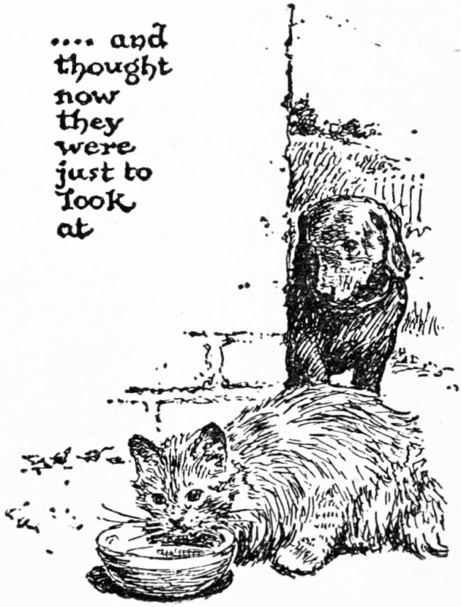 Ju-ju was a cat. She was grey, like smoke, and had a bushy tail and long hair and yellow eyes. I don’t think yellow eyes are very pretty, do you? None of us ever liked Ju-ju very much, although we soon got to respect her. She was very vain of her long hair and thick tail and used to spend hours doing nothing but washing herself. Cats are very lazy, I think, and waste too much time on themselves. Once I asked Mother what cats were for and she sighed and said she used to think they were to chase but she had changed her mind and thought now they were just to look at. Mother had a place on her nose like a scratch where the hair never grew and sometimes I’ve wondered whether Ju-ju made it.[12] When we first got out into the yard Ju-ju used to come and jump on top of one of the fence-posts and look down at us just as though we were funny and strange. That used to make us very angry and we would bark and jump at the post for the longest time. But of course we couldn’t reach her and after awhile she would blink and blink at us and then go to sleep up there! Cats are very annoying.[13] They’re almost as bad as ducks!