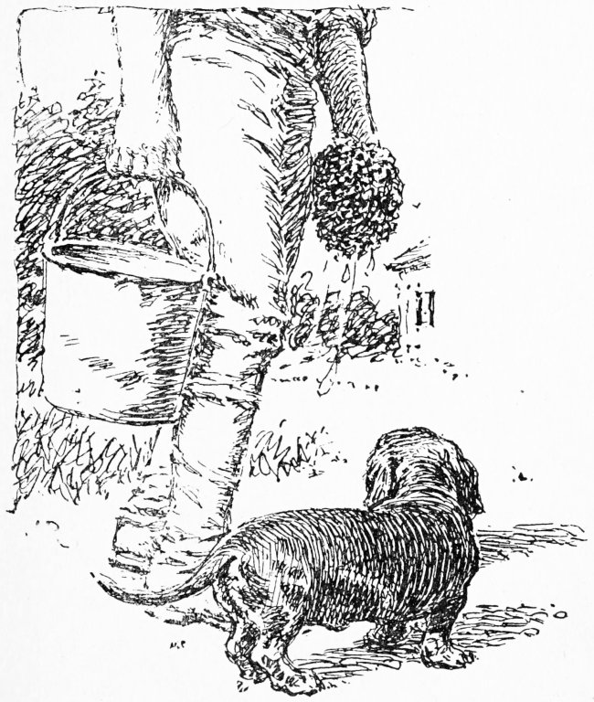 Mother had her paws full looking after us most of that summer and so she was not able to help much with the work. Of course she kept watch and taught us to, and we soon learned who to bark at and who not. When[16] the man from the butcher’s came Mother always made it a point to be very polite to him. She wagged her tail and sniffed his boots and followed him around to the kitchen door. He smelled very nice. Sometimes he gave us small pieces of meat and we were always glad to see him. But when a tramp or a pedlar came Mother barked and the hair stood up all along her back. We soon learned to do the same and tramps didn’t very often come much farther than the gate.