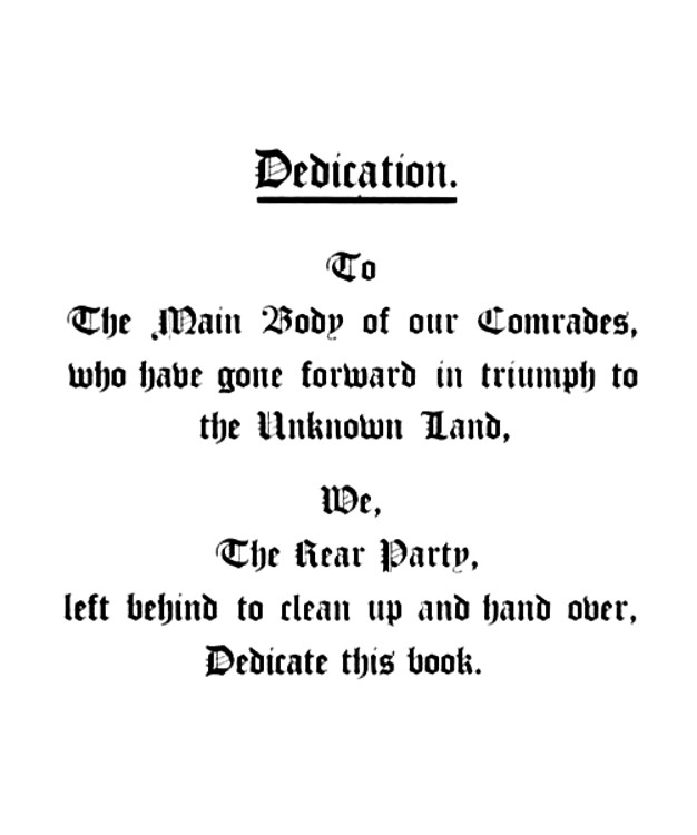 The purpose of this book is to supply to the people of Preston and district, for the first time, a complete and authentic record of the adventures of their original local Territorial Infantry Battalion during the Great War, such a record being a chapter of local history which must sooner or later be written; to put into the hands of the relatives and friends of those who have gloriously fallen the story of the unit with which they served faithful unto death, with its accompanying tribute from their surviving comrades; to supply to the latter ... maimed or whole a book which they may hand down to posterity to speak of their service; and last, but not least, to speak to those who shall succeed to our traditions, of Comradeship, Cheerfulness, Endurance, Devotion to Duty, and all the virtues which go to make up “the Spirit of the Regiment.”
