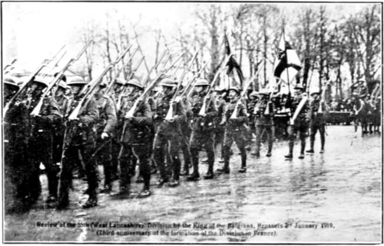 On the 8th August, the Battalion paraded in the Market Square, Preston, and the colours were handed over to the Mayor for safe custody, no one at that time foreseeing that they would remain there for just on five years. A photograph of the colours appears as a frontispiece to this book: in the fulness of time, no doubt, the battle honours earned by the Battalion in the Great War will be embroidered upon them.