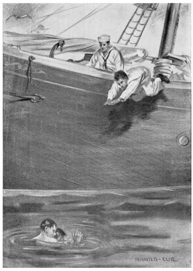 Dick was so absorbed in watching the swimmer that he almost forgot to ring the ship’s bell at five o’clock; and, just as he was doing it, Tom crawled sleepily out of the companionway and joined him.