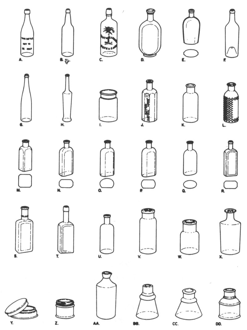 Figure 16. Bottle shapes from the Middleton Place privy (not to scale). A. Champagne beer. B. Export beer. C. Malt whiskey. D. Jo-Jo flask. E. Union Oval flask. F. Bordeaux wine. G. Hock wine. H. Olive oil. I. American preserve. J. Fluted extract. K. Bromo-Seltzer. L. Poison. M. French square. N. Baltimore oval. O. Philadelphia oval. P. Double Philadelphia oval. Q. Plain oval. R. Panel. S. Ball neck panel. T. Oil panel. U. Round prescription. V. Quinine. W. Morphine. X. Free-blown apothecary’s vial. Y. Round patch box. Z. Ointment. AA. Stoneware ink. BB. Bell mucilage. CC. Cone ink. DD. Cylinder ink.