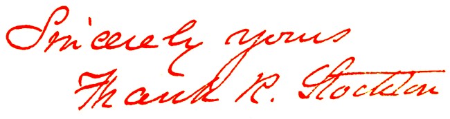 Ten years have passed. Mr. Stockton died in April, 1902. None[7] of his immediate family remain. The friend for whom he dictated this quaint little tale has regretted that her pleasure in it was not being shared by others. Her interest in the Eastern Branch of The United Workers of Greenwich, Connecticut, has prompted her now to give the story to them for publication. The magazine rights were sold to the Curtis Publishing Company. The money thus obtained has been expended in producing this edition of one thousand copies—the first edition of one of the last tales of America’s well-loved story-teller.