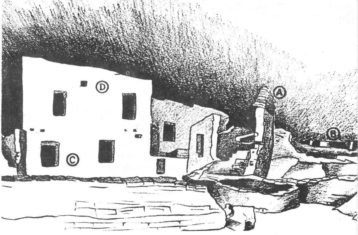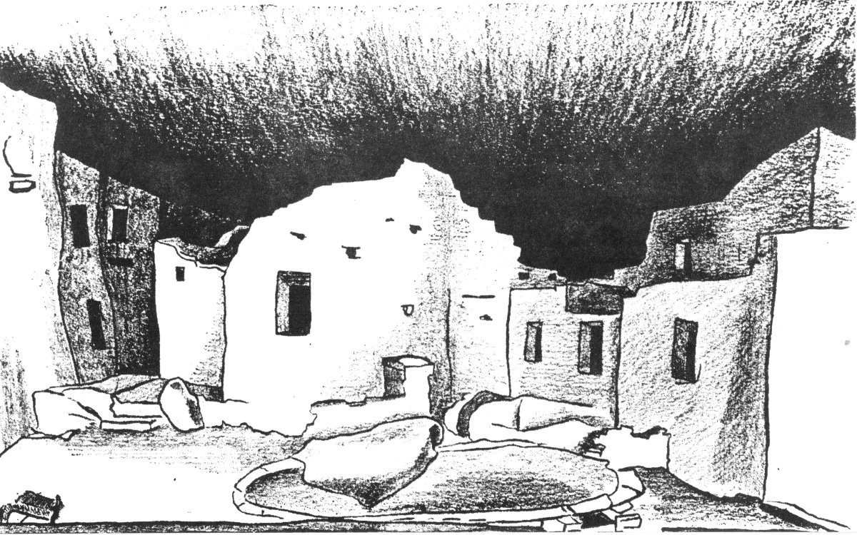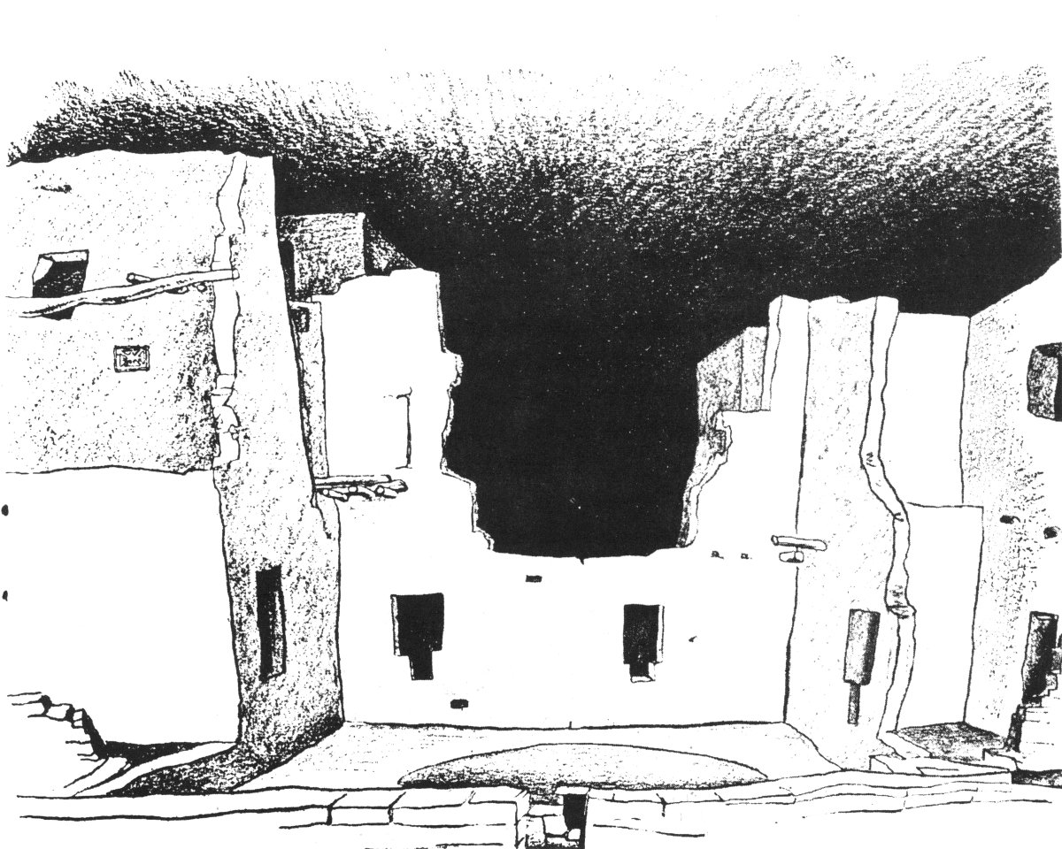 The ground plan on Page 6 shows the arrangement of the rooms. Most of these were in double rows within the cave; in some places there were three rows. The interior rooms, dark and poorly ventilated, were probably used for storage. The central portion of the structure was built three stories high and reached the cave ceiling; most of the buildings, however, were only two stories in height.