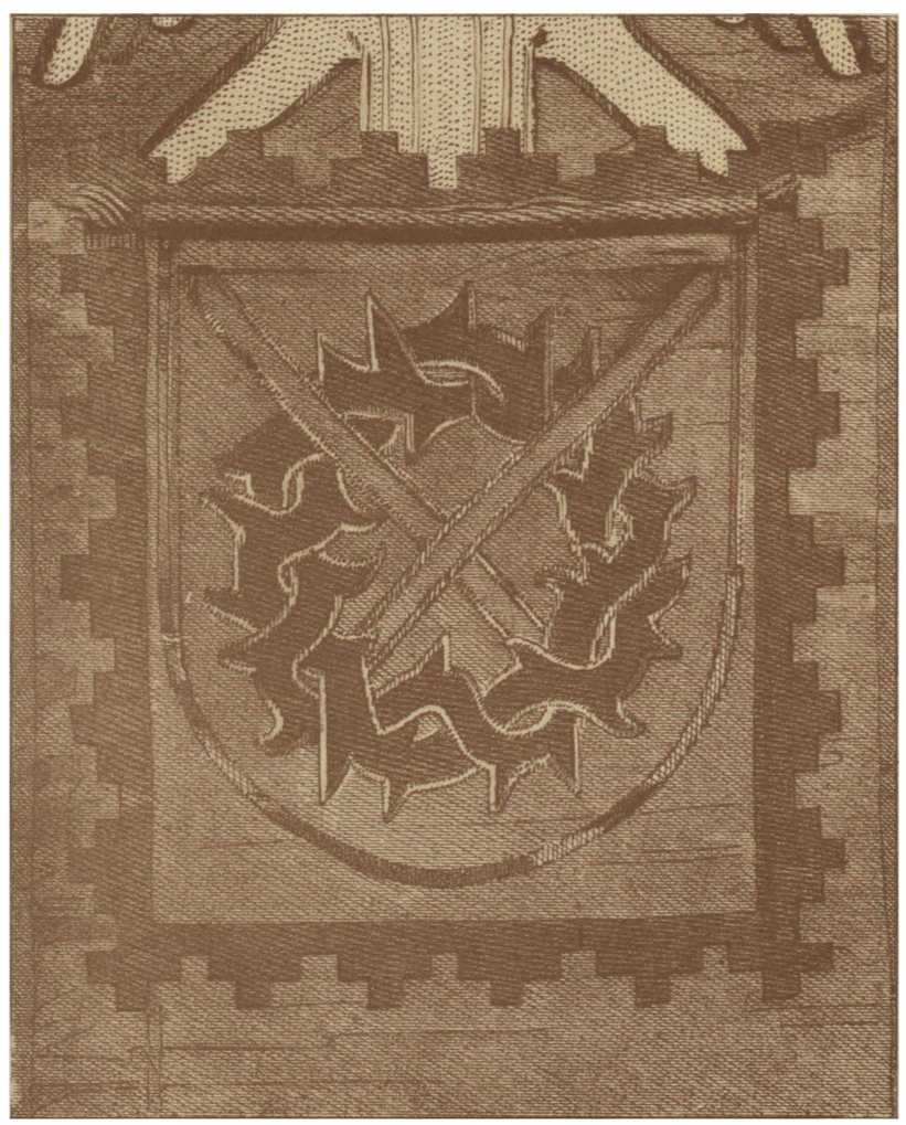 Funeral Banner, calico, emblazoned with armorial shields. English, 18th century. Length 1 foot 2 inches, width 1 foot 4 inches. Presented by the Rev. R. Brooke.