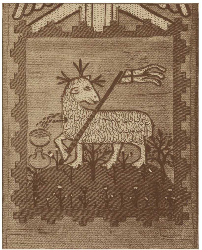 The broad border to this large piece is designed with elaborate care. At each of the two lower corners it is figured with the one same subject, which consists in a group of three naked winged boys or angels; of these one holds a short-stemmed cup or chalice, from out of which rises a host or large round altar bread, showing marked on it our Lord hanging upon the cross, between the B. V. Mary and St. John Evangelist; a second angel kneeling has in his hands an uplifted crown of thorns, while lying behind him are two books; and the third angel shows us a tablet written with the Greek letters Α Ω. All the rest of this frame-work is filled in with flowers, fruits, birds, and snakes. Of the flowers the most frequent are the fritillary, the rose, the lily, the amaryllis, poppies, white campanulas, large daisies, fleurs-de-lis, and corn-flowers. Among the fruits we see the pomegranate, of which some are split, pears, Indian corn, apples, plums, and figs. The birds are mostly parrots, woodpeckers, storks, cocks, doves, and some other birds of the smaller kinds. In places may be discovered a knot of snakes coiled about a garland made of yellow leaves.