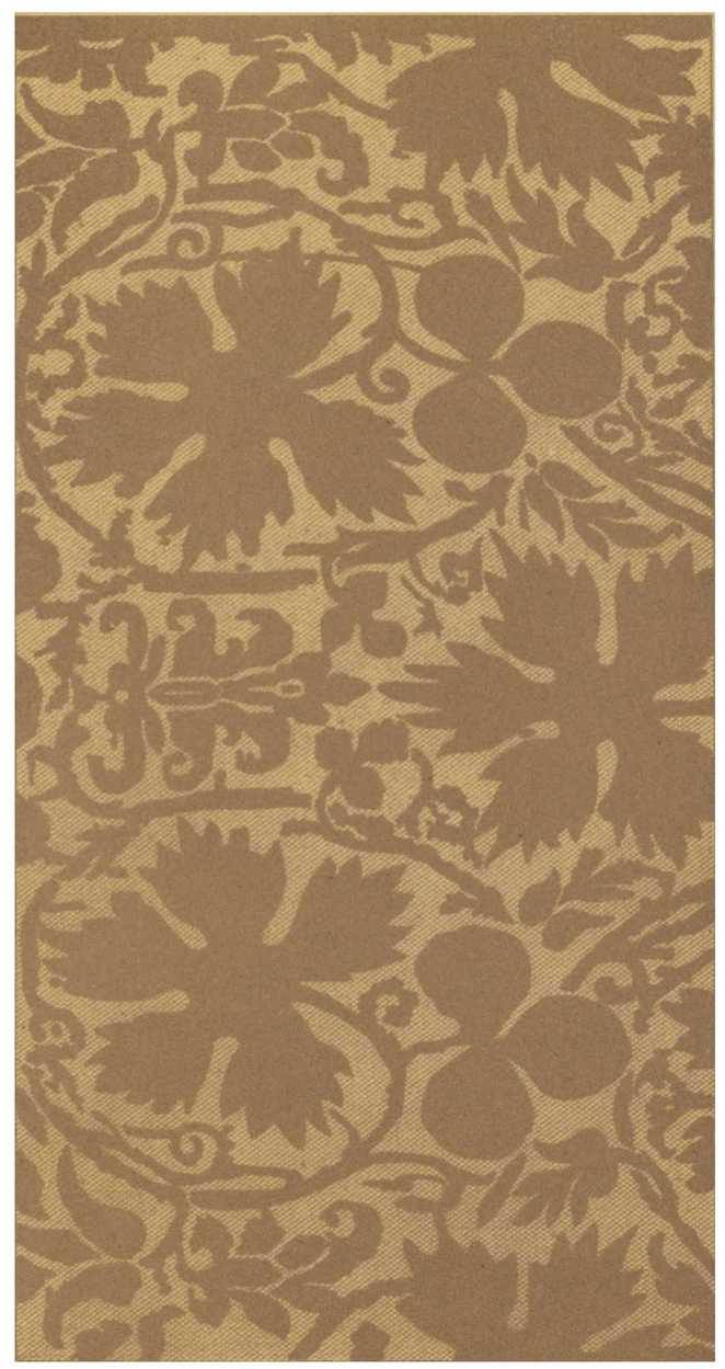 Within a rather broad panelled arch, wine-red in its tone, is figured the young Bacchus with a couple of thyrsus-staves, crossed saltire-wise above him: below, is a fountain with an animal’s face, from the mouth of which runs red wine, and by it two little satyrs playing with tigers, into whose open maws they are squeezing the juice of the purple grape. Within a tablet in the higher part are figured two letters M. M. seemingly the ciphers of the individual for whom this piece was woven.