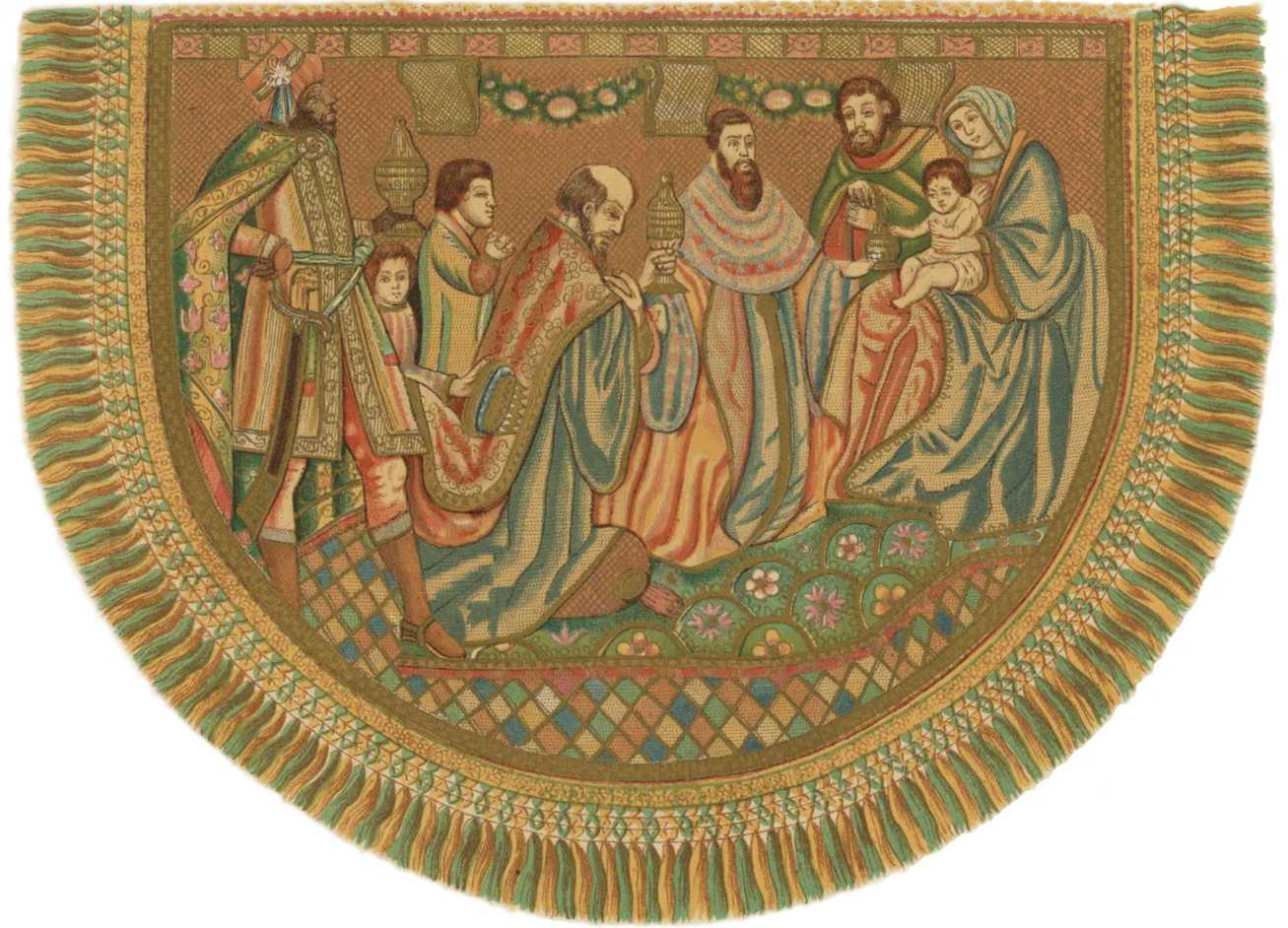 Embroidered by hand in silks & gold, with the Adoration of the Magi, & bordered with green & yellow silk fringe. __Flemish 16th. century.