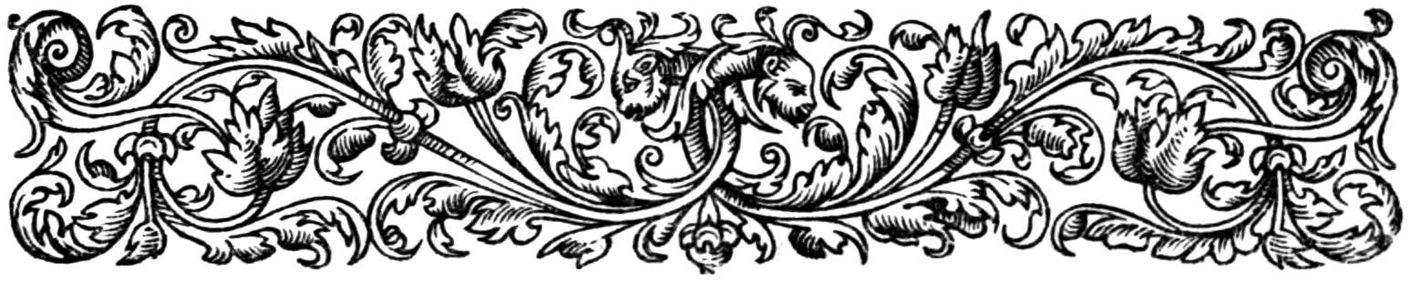 On the lower band, standing one at each side of a short pedestal, or rather low dado, are, back to back, two bearded grotesques, each of which is made up of a human head and face having three goats’ horns growing out of the forehead, and of a wyvern’s body, holding aloft in one of its claws a tall tapering torch. Further on comes a series of spaces peopled with emblematic personages, and separated from one another by two little naked winged boys standing on a highly elaborate zocle, and with the left hand swinging by a cord, at each end of which hang from a ring, and done up in bunches, fruits and flowers. In the first space is “Prudentia,” bearing in her right hand a long-handled convex mirror, in her left, a human skull; in the second space, upon a sort of throne, sits “Sollicitudo,” upholding in her right hand an oblong square time-piece, while on her left, with her elbow propped up by one arm of her chair, she leans her head as if buried in deep thought; in the third space sits “Animi-(Probitas)” with both her arms outstretched, as if reprovingly; in the fourth space we have “Ceres,” the heathen goddess of corn: crowned with a wreath of the centaurea flowers, she carries ears of wheat in her right hand, in her left, a round flat loaf of bread; in the fifth space, “Liberalitas,” who, from the emblems in her hands, must have been meant to personify not generosity but freedom, for in her right hand she shows us a hawk’s jesses, with the bells and their bewits, and on her left wrist, or, as it should be phrased, the “fist,” the hawk itself without jesses, bells, lunes, or tyrrits on—in fact quite free.
