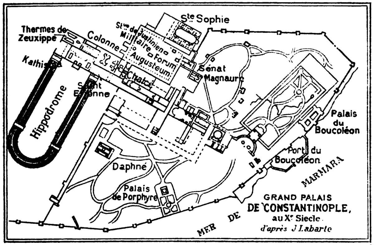 Byzance, avec ses sept collines, ressemblait beaucoup à Rome. L’Empereur fit élever des murailles autour de cinq collines; puis, à l’intérieur, il bâtit des palais, des églises, des thermes, des aqueducs, des fontaines, un forum, un augustéon, deux grands édifices pour le Sénat, deux palais pour le trésor, et une rue principale, ornée de portiques, qu’on appela la Mésè. Toutes ces constructions coûtèrent des sommes énormes à l’Empire, et comme elles avaient été faites à la hâte, on eut beaucoup de peine par la suite à empêcher leur écroulement.