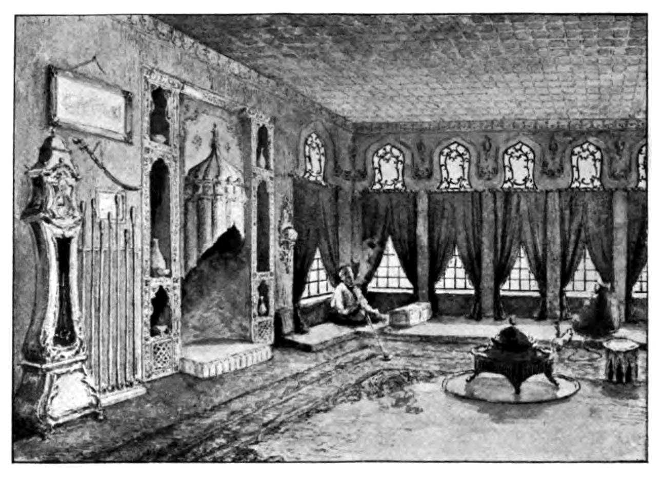 54. Vieux Sérail. Intérieur.—Intérieur d’une maison turque au XVIIe siècle. (D’après un dessin de l’auteur.) 273