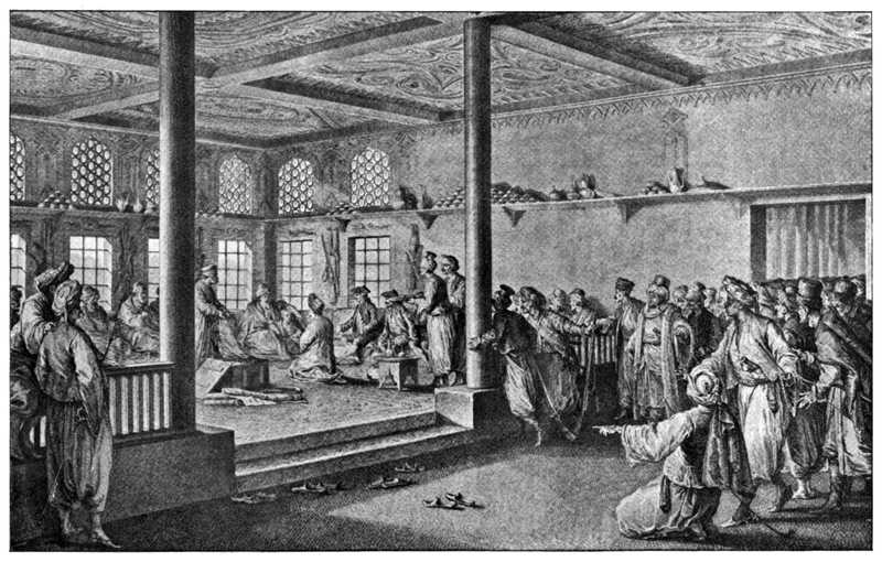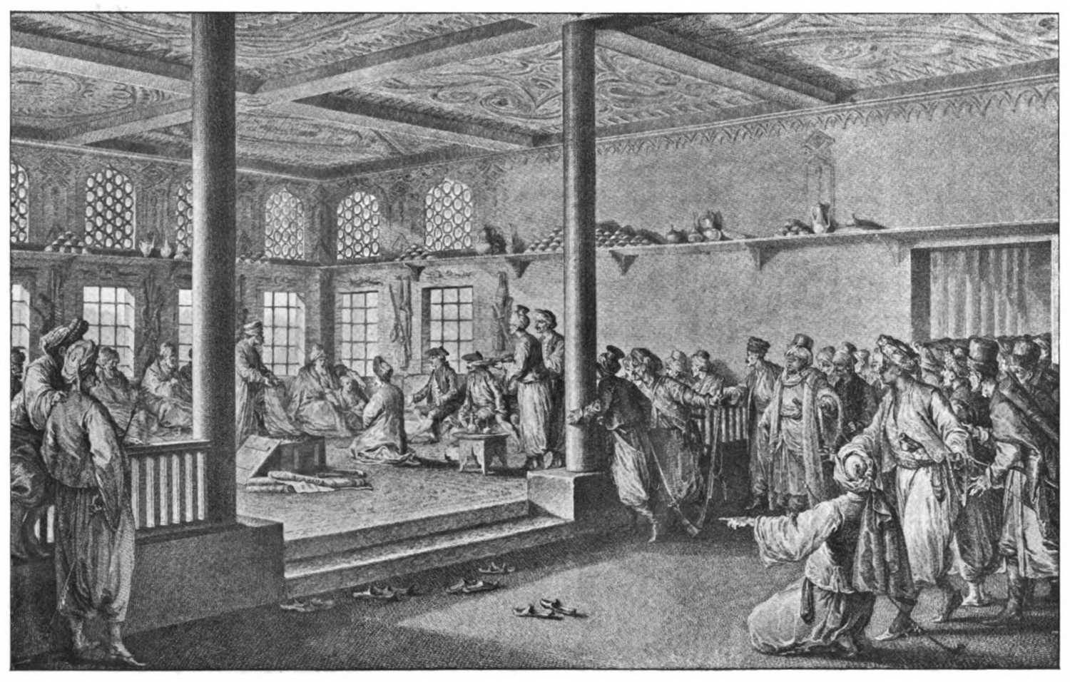 56. Intérieur turc a l’époque des Janissaires. Réception des étrangers. (Gravure de A.-J. Duclos d’après les dessins de Moreau le Jeune.) 281