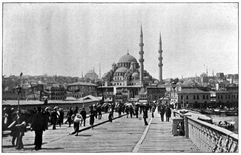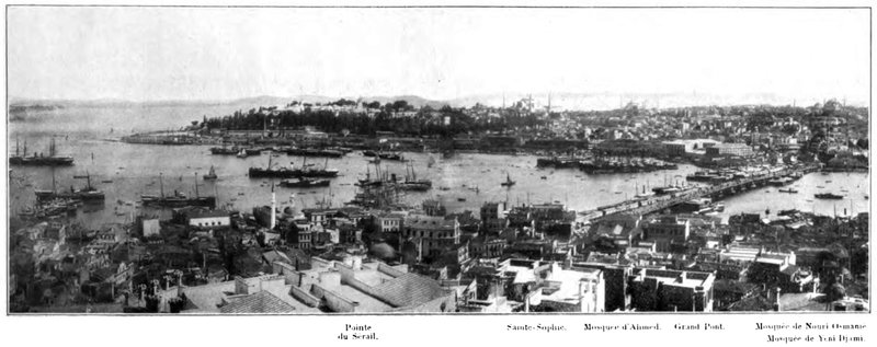 Le mot Bosphore dérive des mots grecs (βοῦς, bœuf, πόρος, passage); d’après la mythologie grecque, ce détroit aurait été traversé à la nage par Jo, fille d’Inachus, premier roi d’Argos, que Jupiter avait changée en génisse et qui avait été confiée à la garde d’Argos par Junon. Le Bosphore réunit la mer Noire (Pont-Euxin)[2] à la mer de [p. 2] Marmara (Propontide). Avec ses rives et ses collines pittoresques, il donne à la ville un charme caractéristique, qui en fait une des plus belles cités du monde.