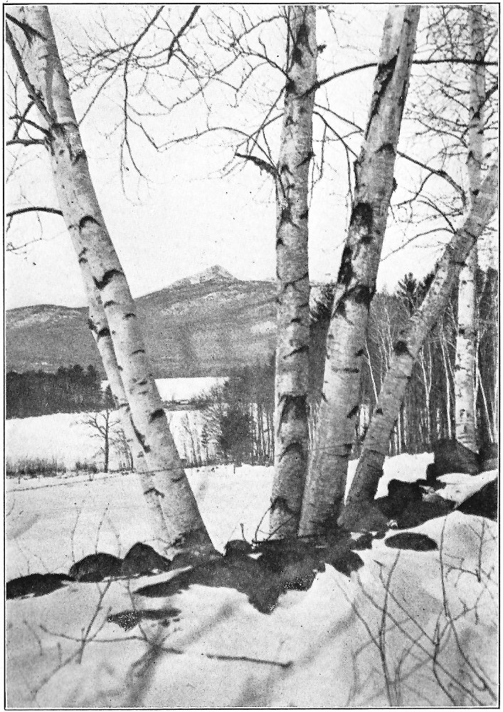Leaving the swamp, I climbed the terrace marking the ancient border of the lake, which once included the swamp in its area, and passed through a grove of slender birches and poplars. Their stems, streaming with rain, were as bright as polished marble, and their foliage, illuminated by the clear sunlight, was marvelously green against the deep blue of the sky. Presently a vista opened northward, and at its end rose the dark peak of Chocorua. After a rain this towering rock presents a noticeably different appearance from its normal coloring. Most of its surface is covered by lichens, one species of which, when dry, resembles burnt paper. When rain falls upon these lichens they alter their tints, and the burnt paper species in particular becomes so green that a wonderful 8 change takes place in the whole coloring of the mountain. Looked upon through the birch vista, the air being clear and clean, and the colors of the mountain uncommonly bright, the peak seemed near at hand, and even grander than usual. There are few things in New England as truly picturesque as this horn of Chocorua. Three thousand feet above its lake and the level of the Saco, the great rock lifts itself with bold and naked outline into the midst of the sky. No foot seems able to creep up its precipitous slopes to its dizzy tip, and even the sturdy spruce can cling only to the deep clefts in its storm-swept ledges. There was a time when the forest reached to its crest, and when the cold rocks, now naked, were covered deep in soil and mosses. Passaconaway, close by, shows how this could have been, and how Chocorua must have looked draped in evergreens. Fire and hurricane destroyed the trees; the parched soil was washed away from the rocks; and now the only trace of the old forest growth is an occasional bleached stump or log hidden in a cleft in the ledges.
